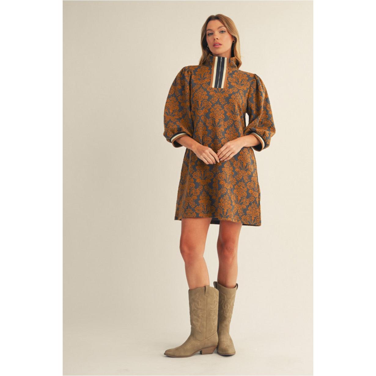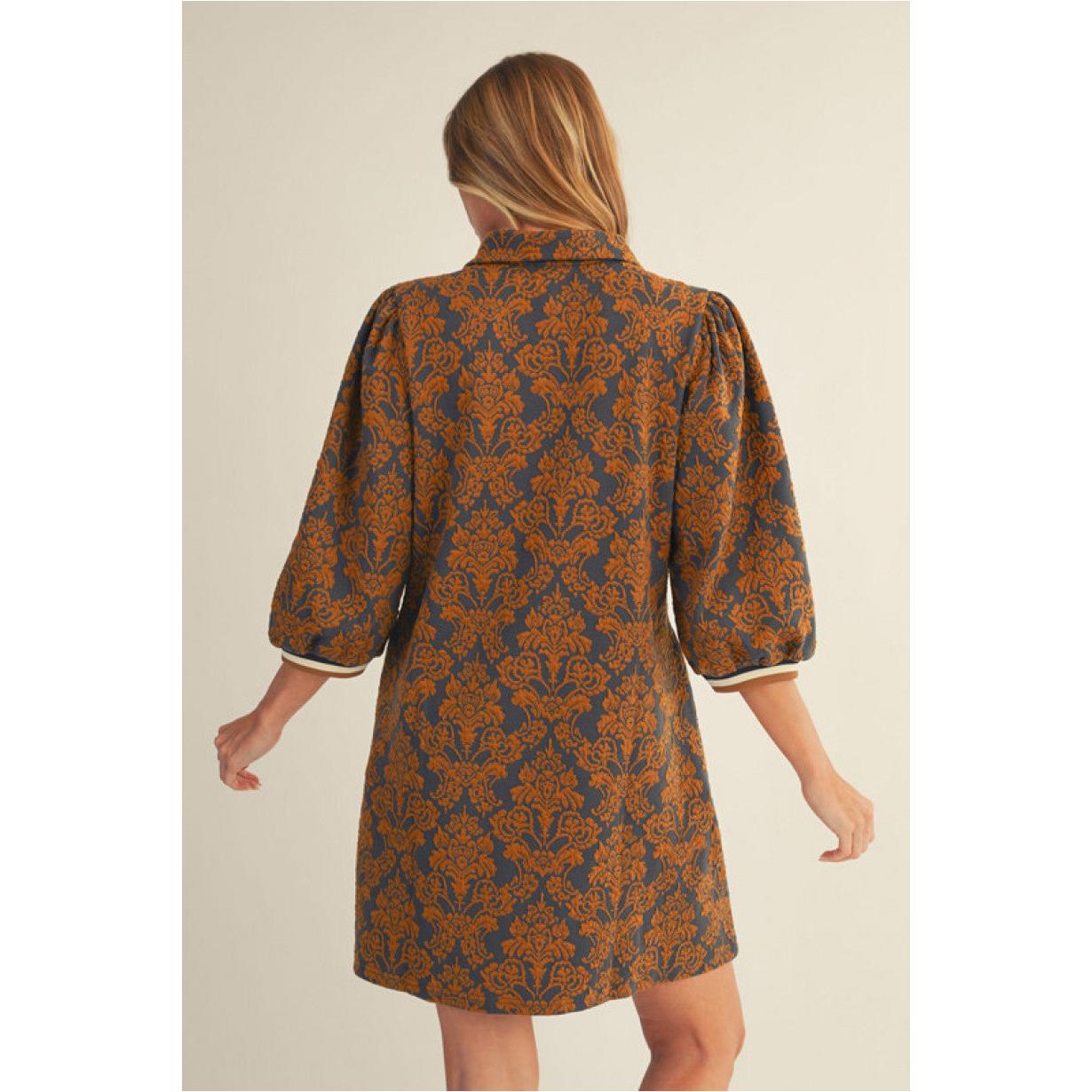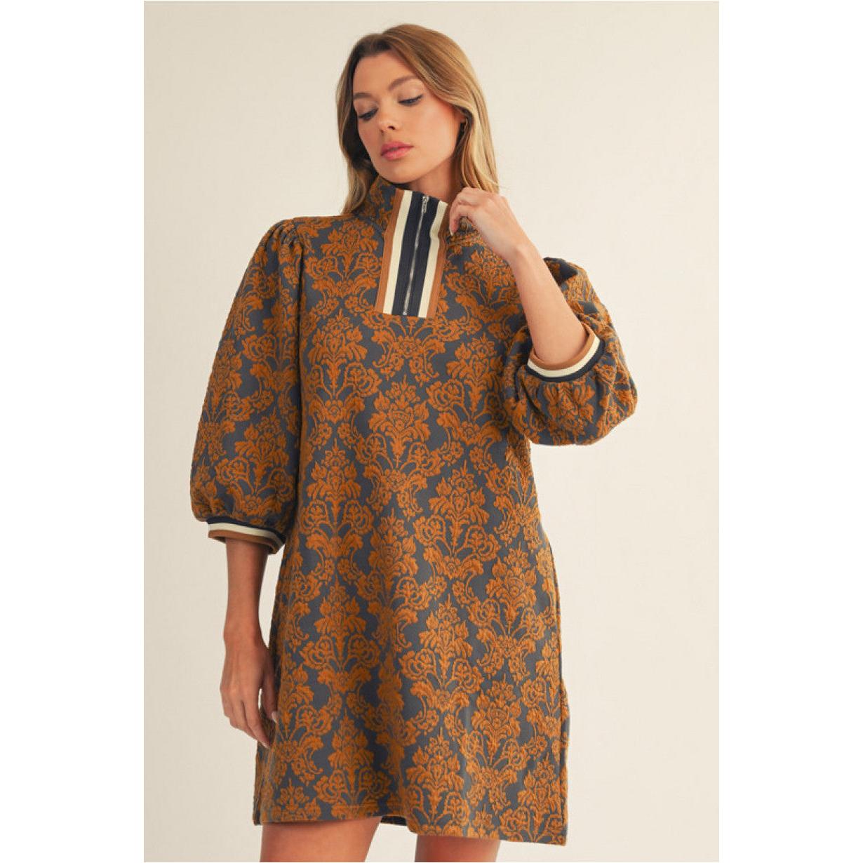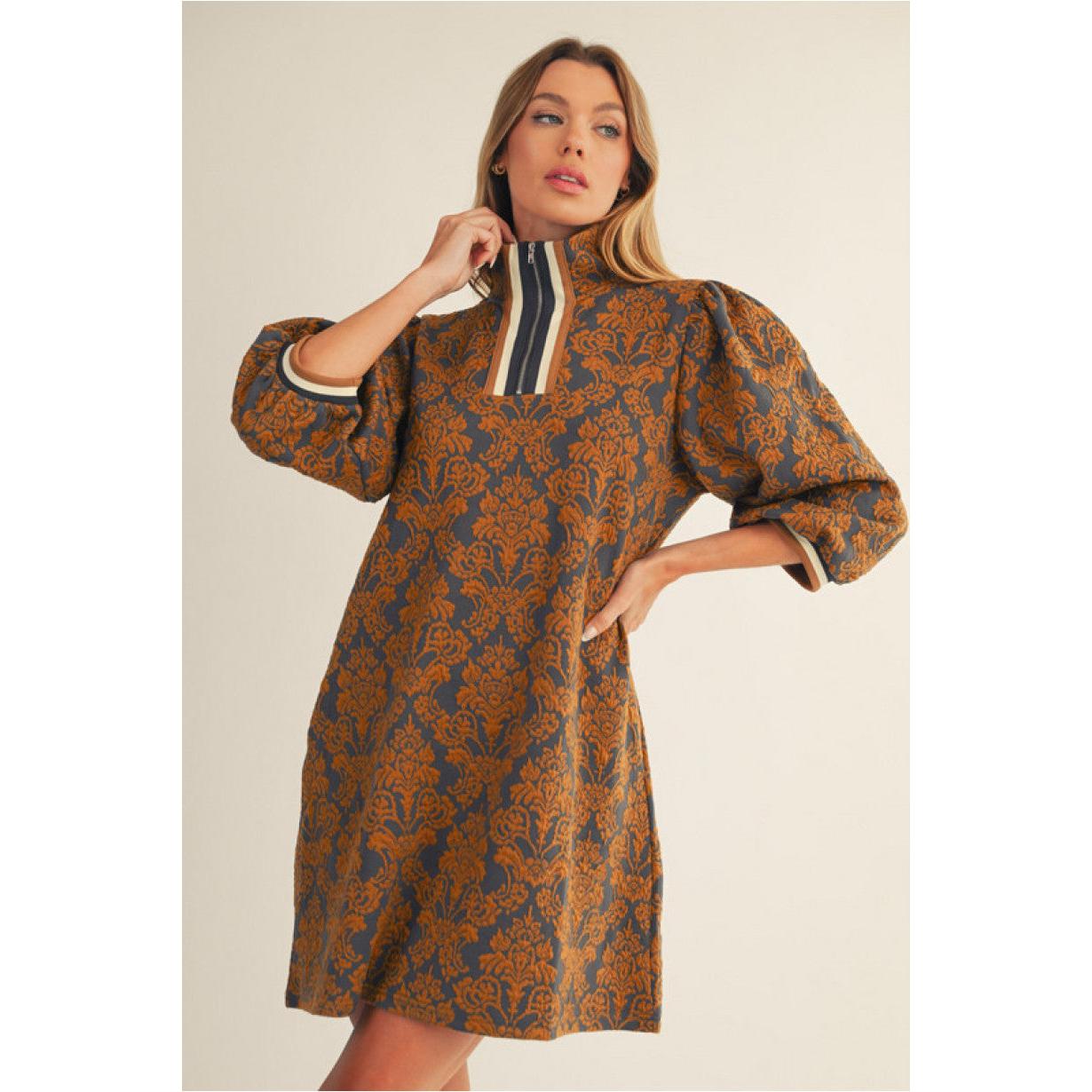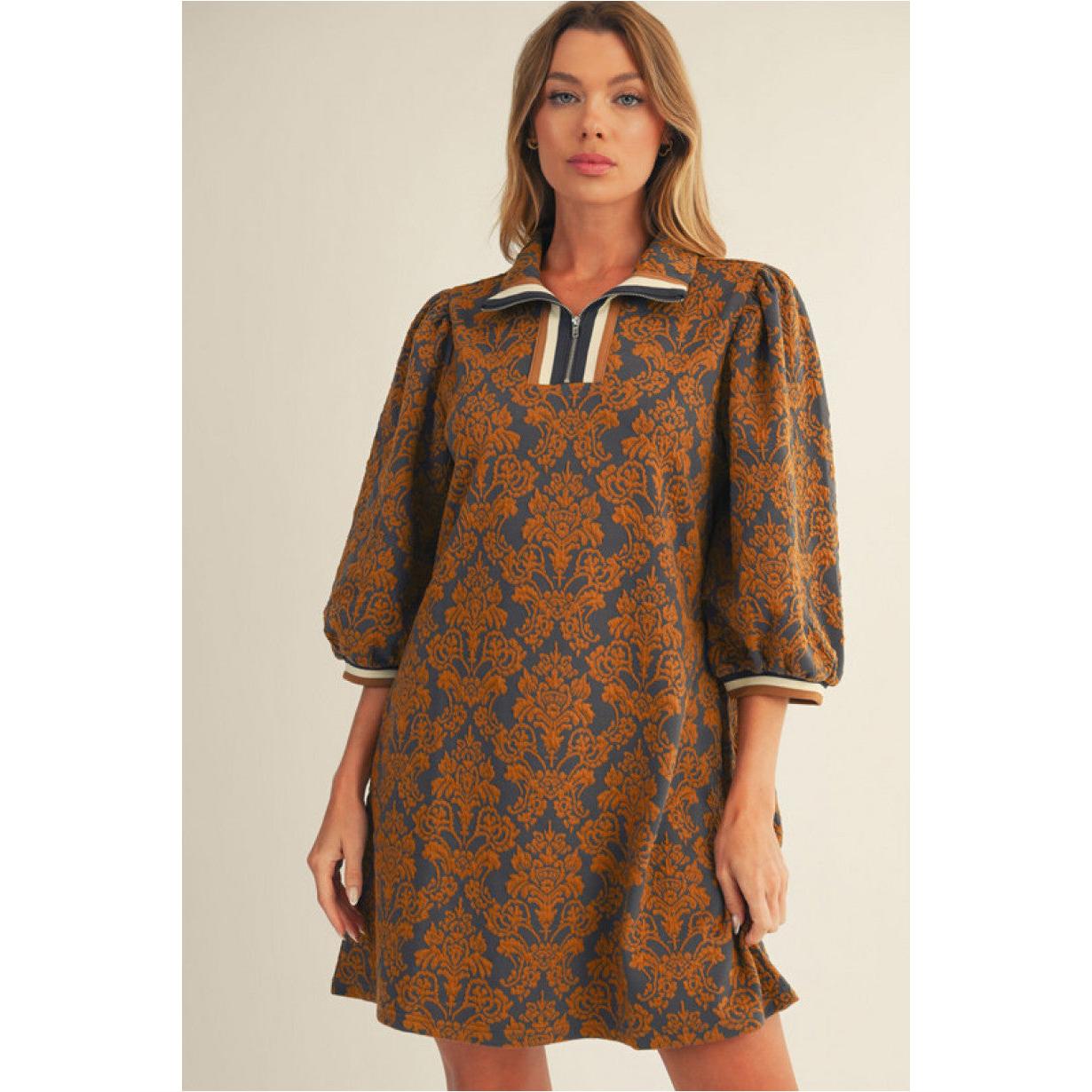3/4 sleeves boho pattern textured shift dress with side pockets, front zip up, color rib band accent.