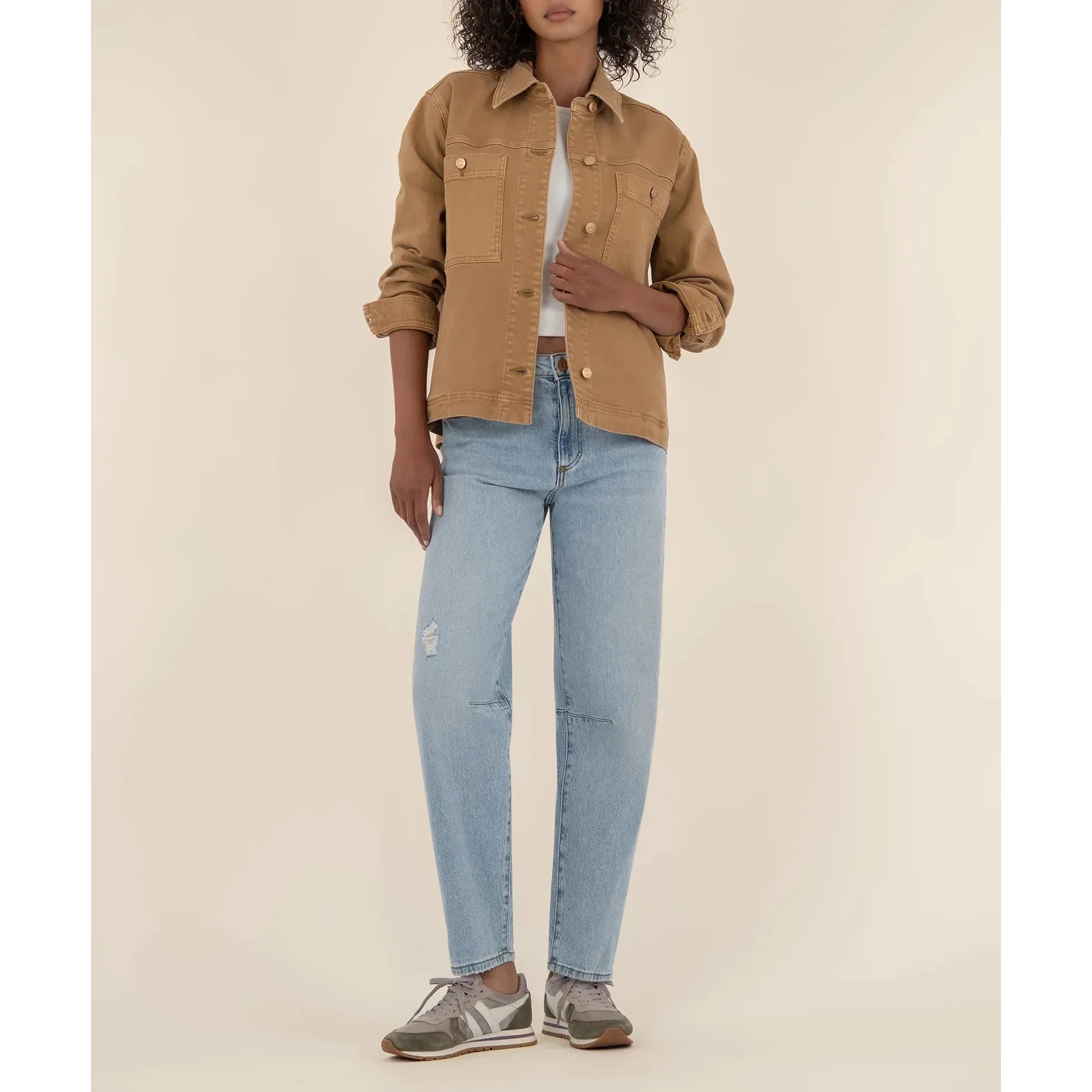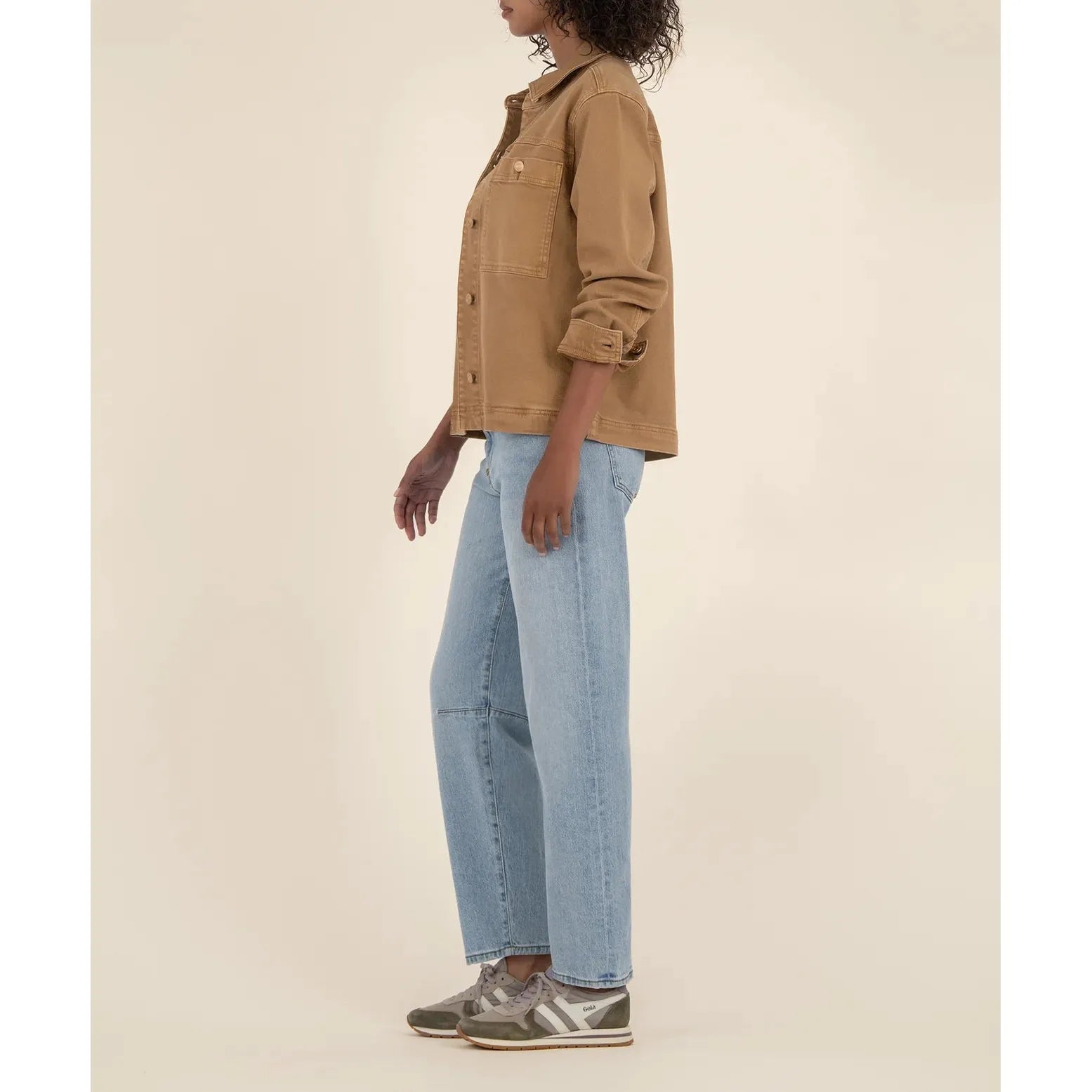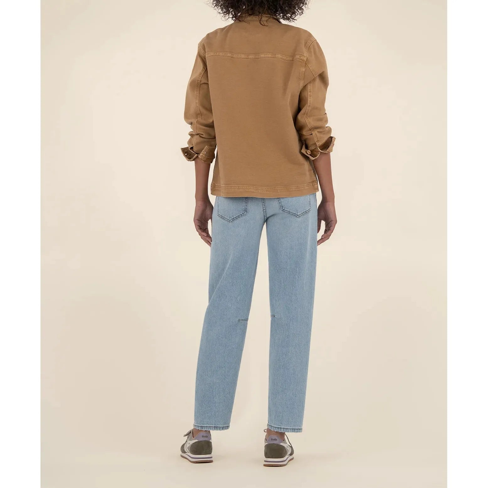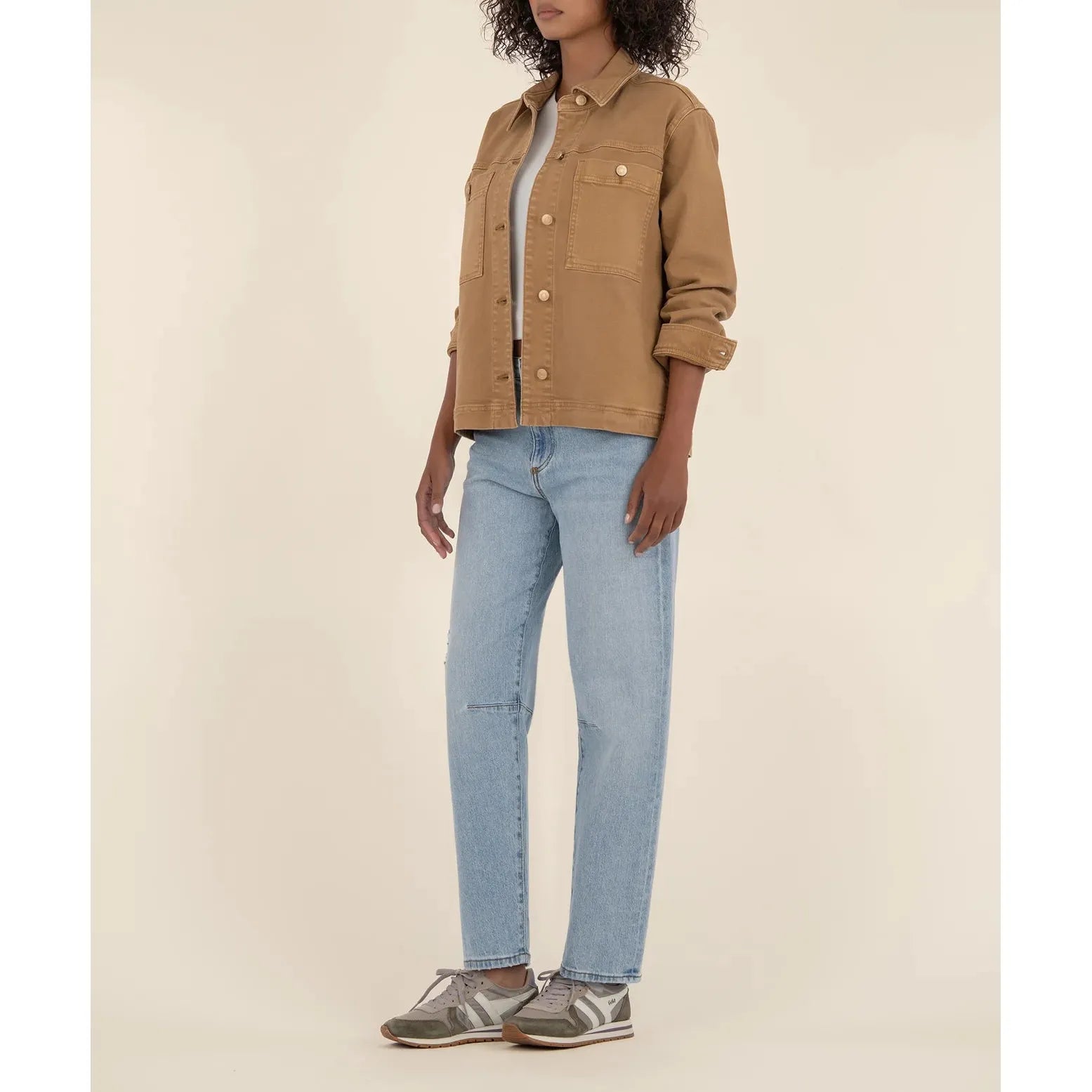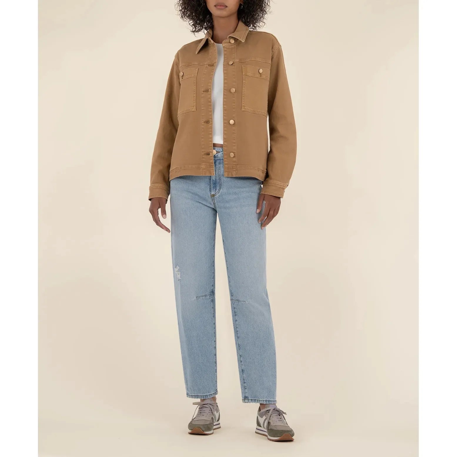 This caramel-colored jacket features a classic shirt collar and buttoned pockets for a timeless, structured look. Perfect for layering with effortless style.