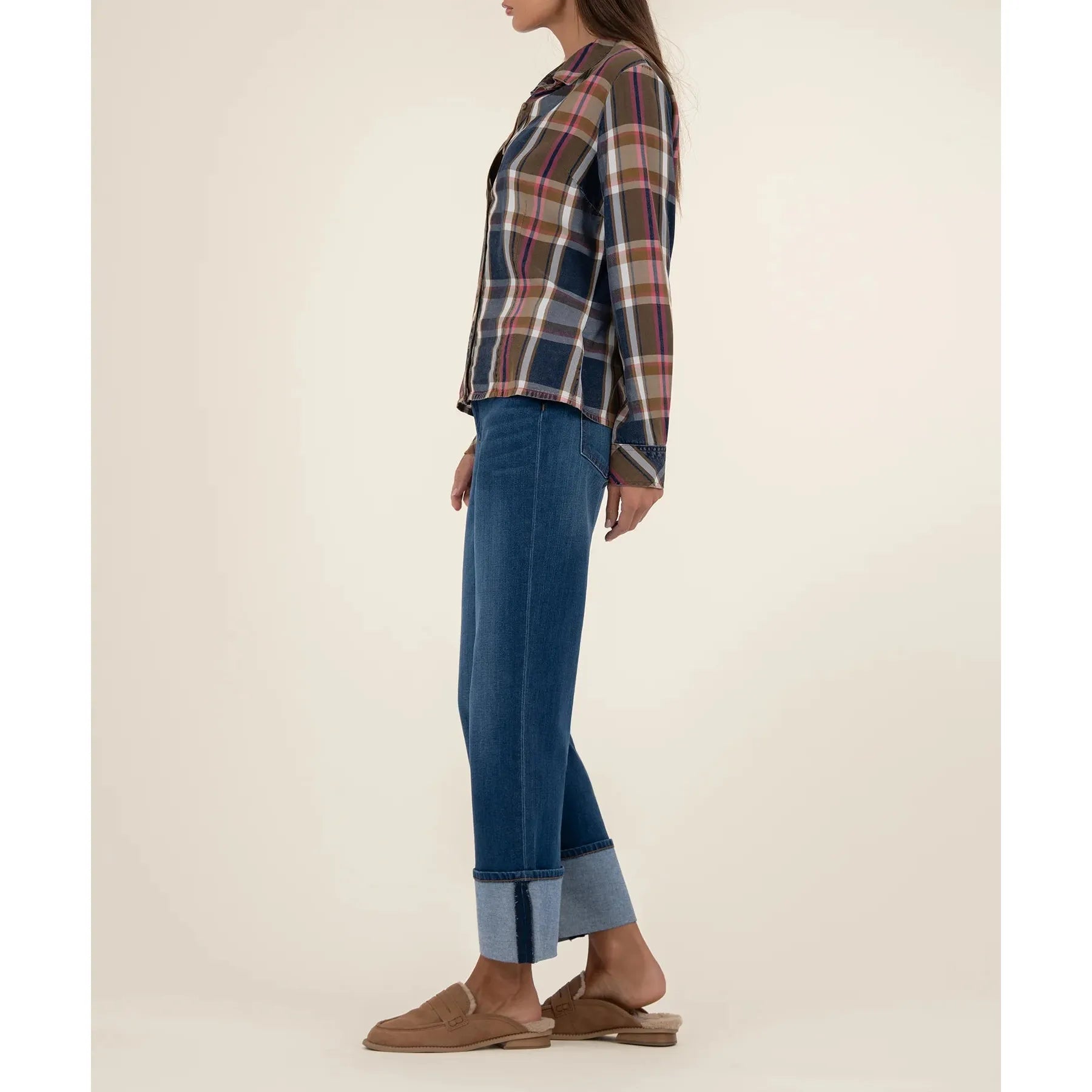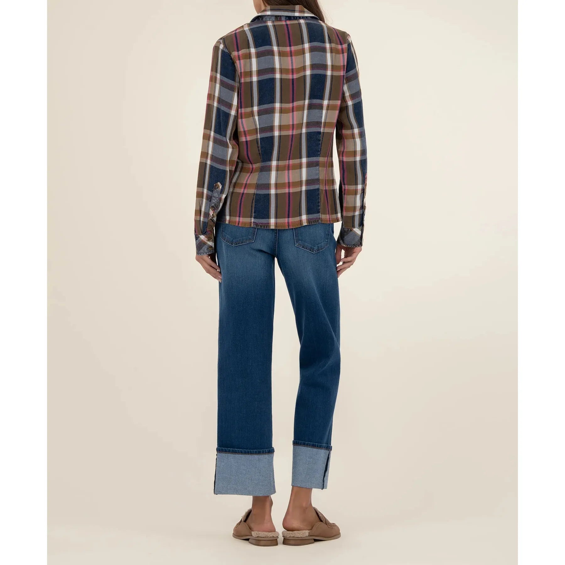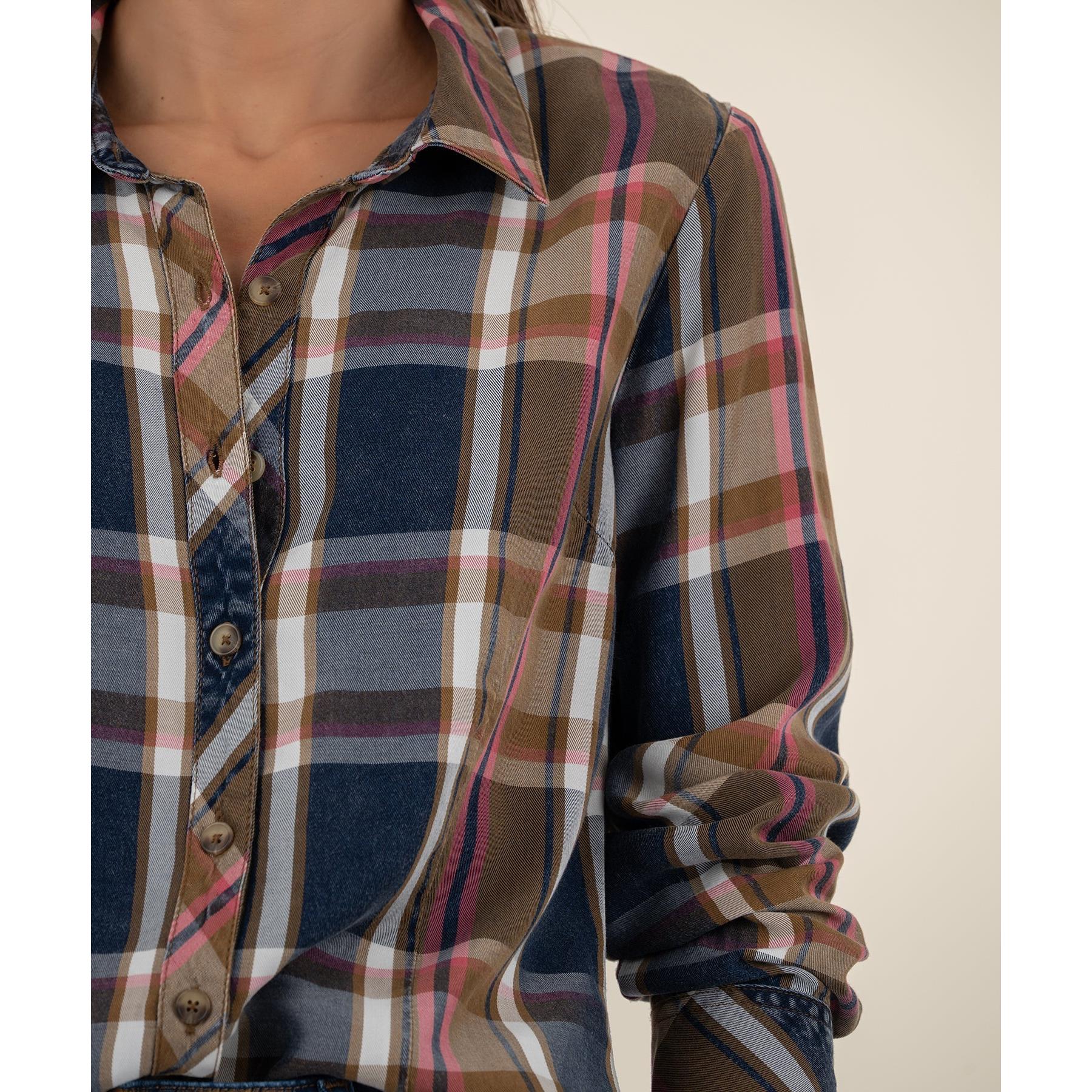 This fitted long-sleeve shirt combines comfort and style with its soft Tencel material and flattering silhouette. Featuring a classic brown plaid pattern accented with a subtle touch of pink for a modern twist, it’s perfect for elevating your everyday wardrobe.