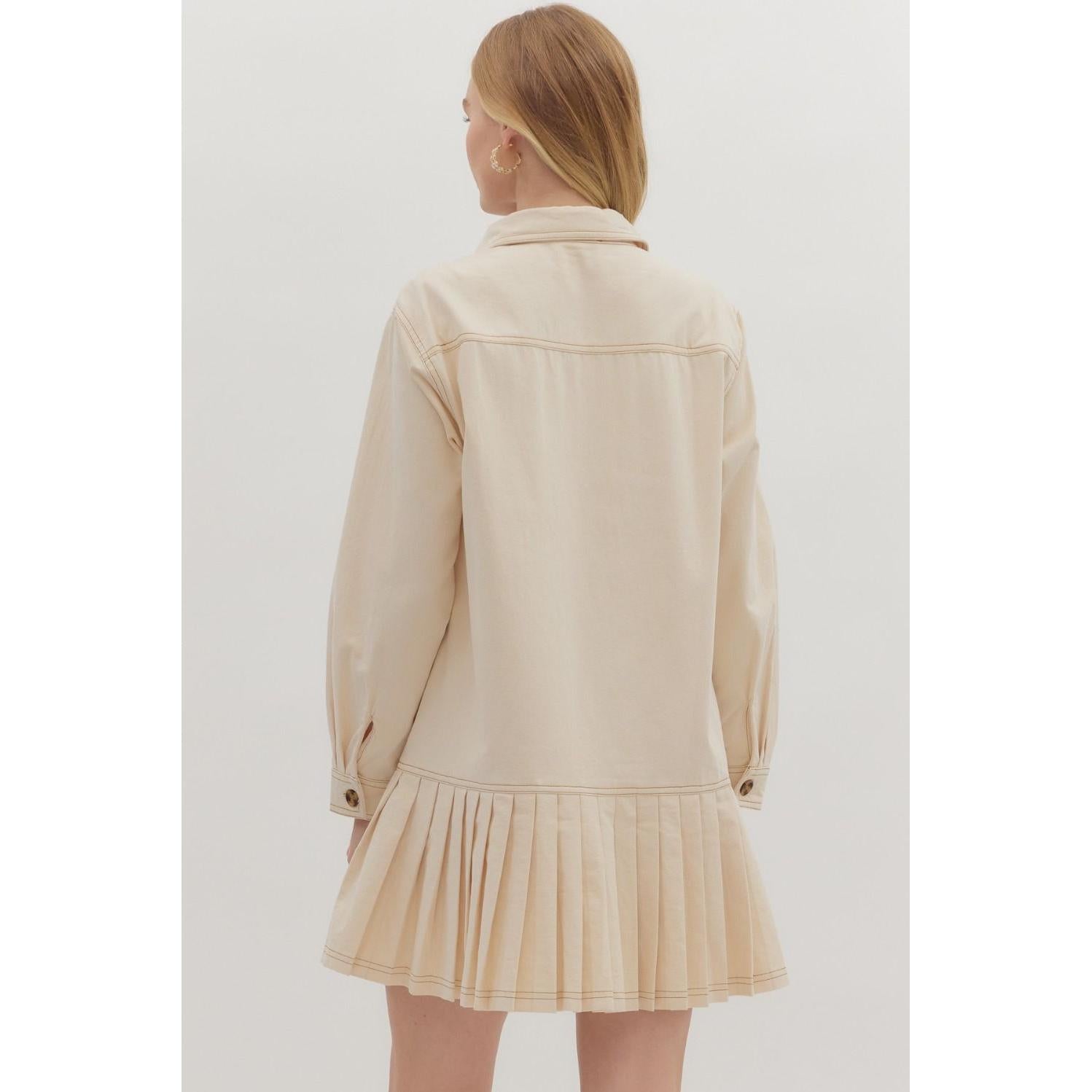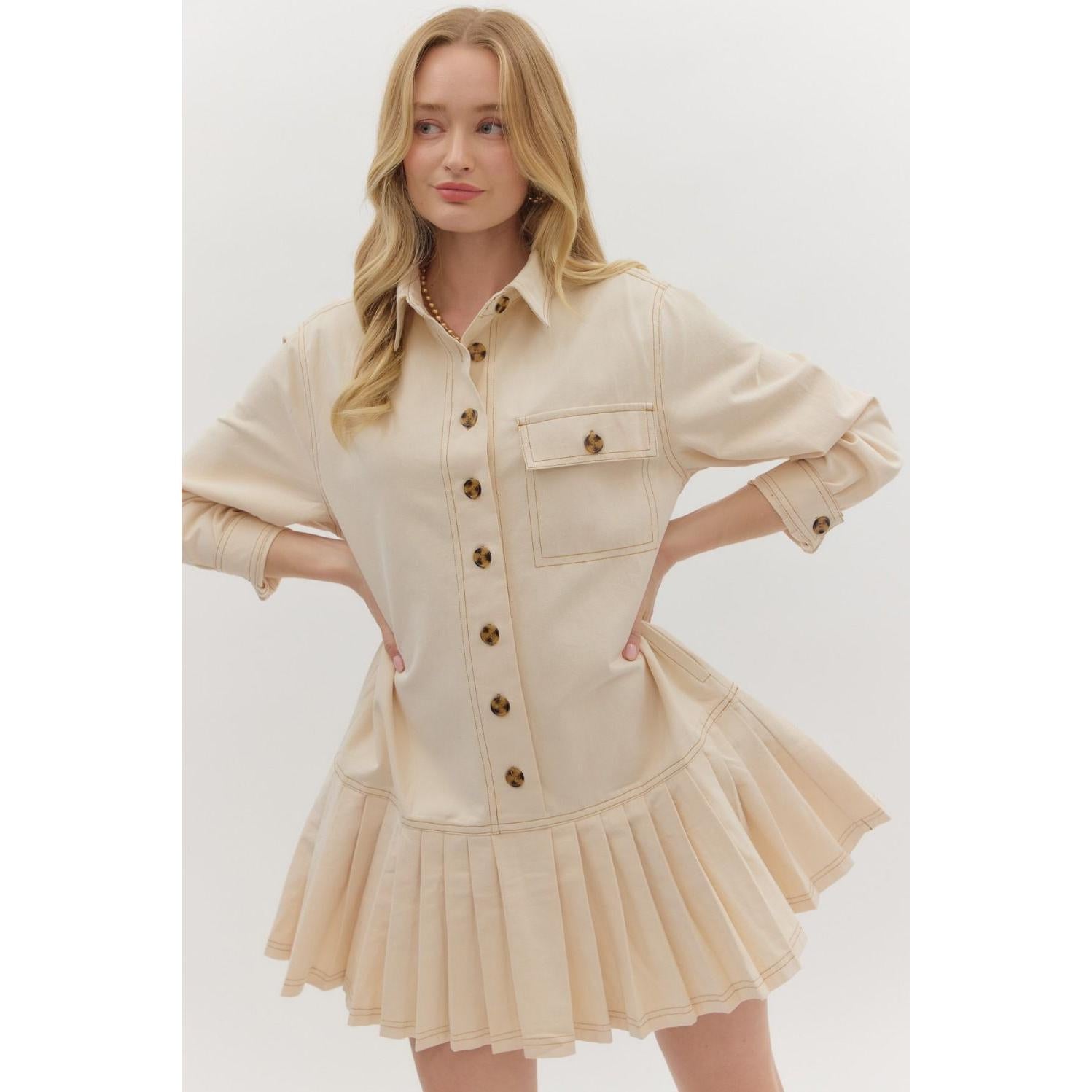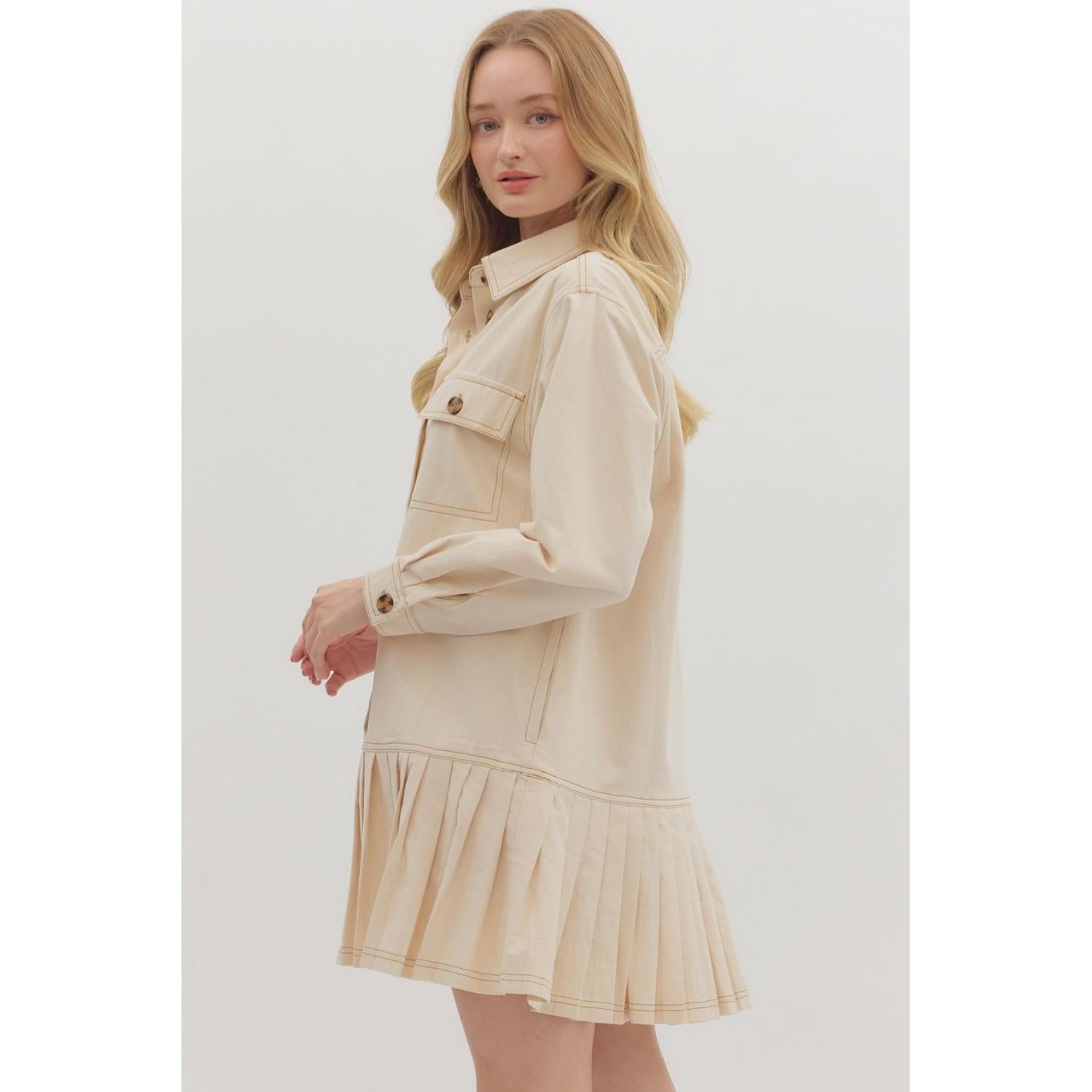 Solid long shirt sleeve pleated ruffle hem collar button closure mini dress featuring contrast accent stitch detailing. Side pockets. Unlined. Woven. Non-sheer. Lightweight.