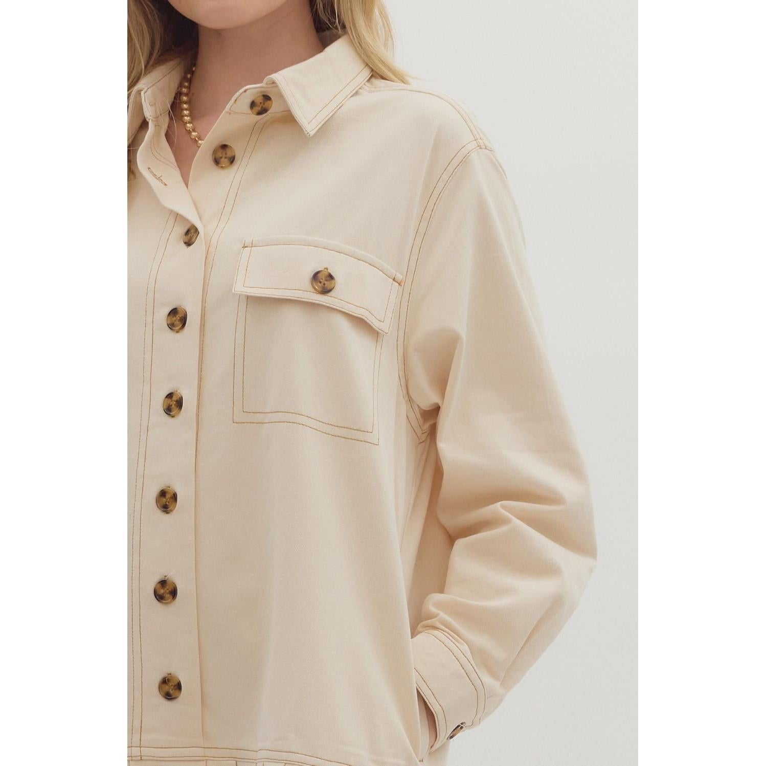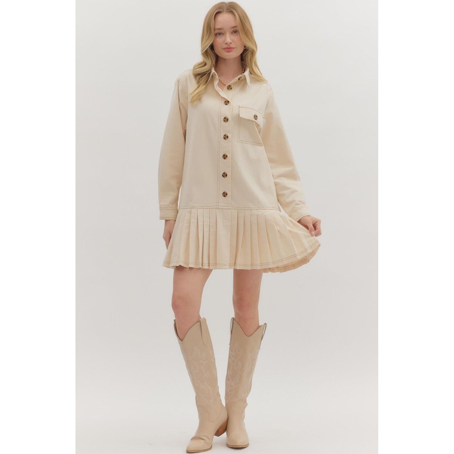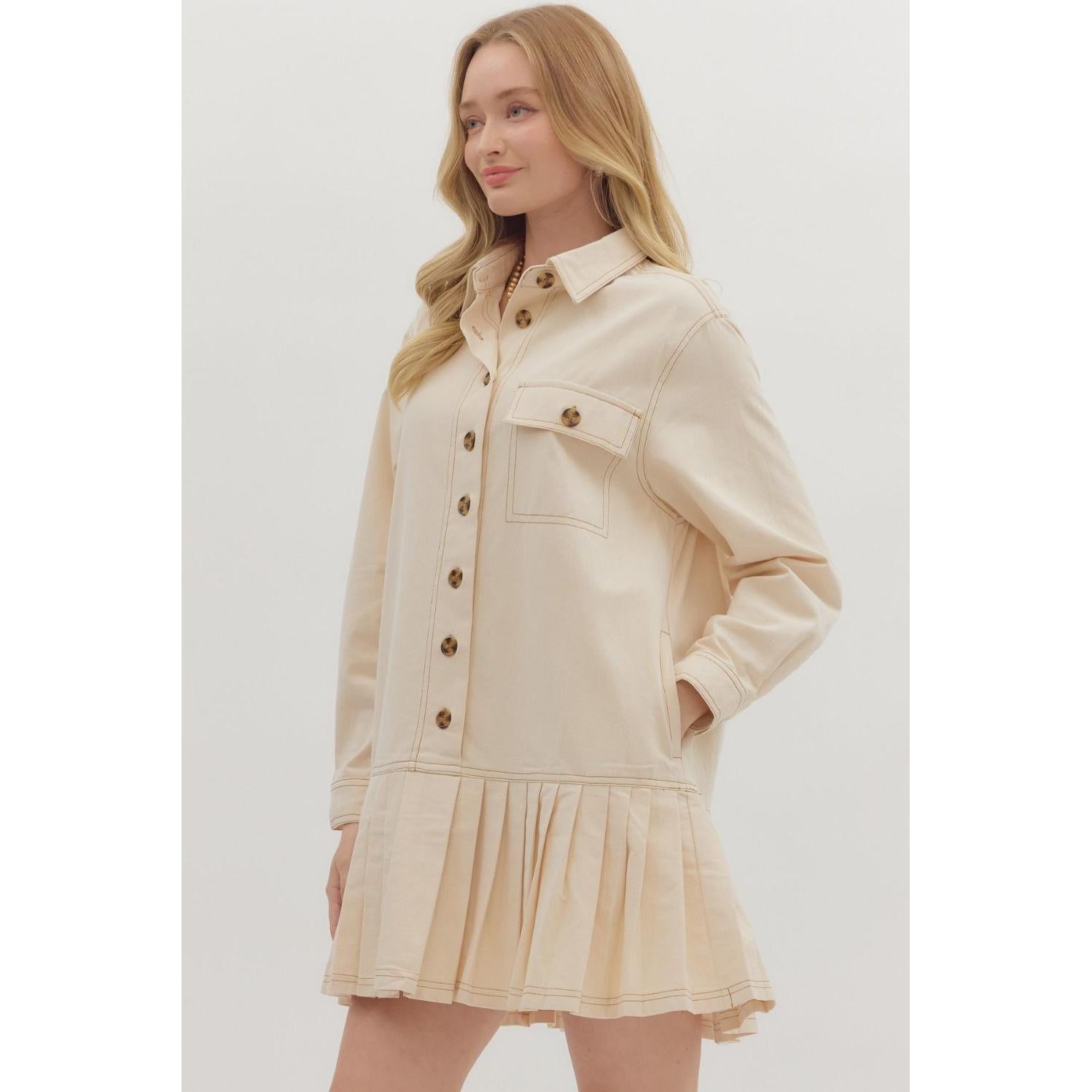 Solid long shirt sleeve pleated ruffle hem collar button closure mini dress featuring contrast accent stitch detailing. Side pockets. Unlined. Woven. Non-sheer. Lightweight.