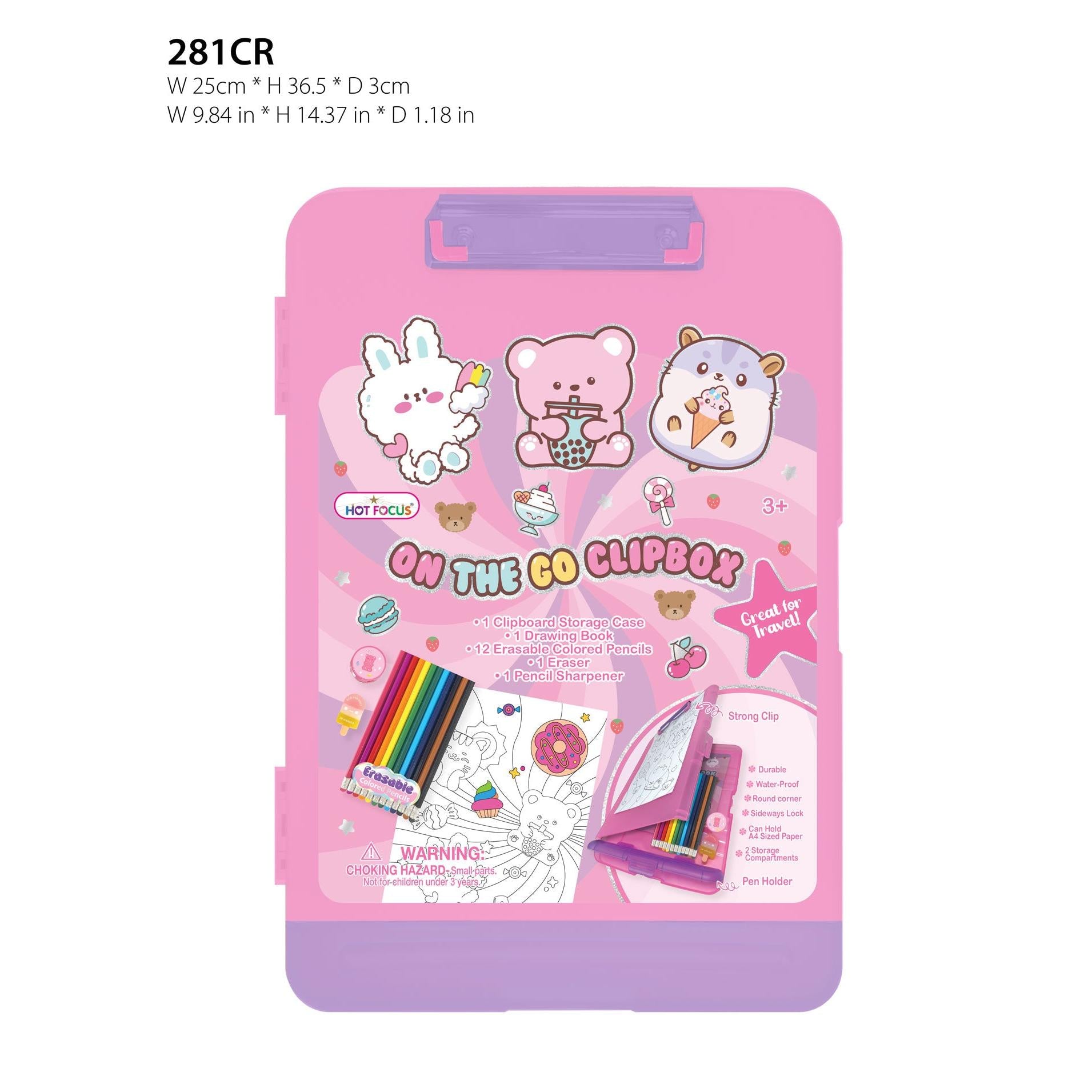 Get creative anytime, anywhere with the Hot Focus Critters On the Go Clipbox! This adorable art set includes a clipboard storage case, drawing book, 12 erasable colored pencils, eraser, and pencil sharpener—all featuring cute critter designs. Perfect for travel, car rides, or quiet time at home, this set keeps kids entertained while encouraging imagination and creativity. Durable, portable, and full of fun, it’s the ultimate on-the-go art companion for little artists ages 3 and up!