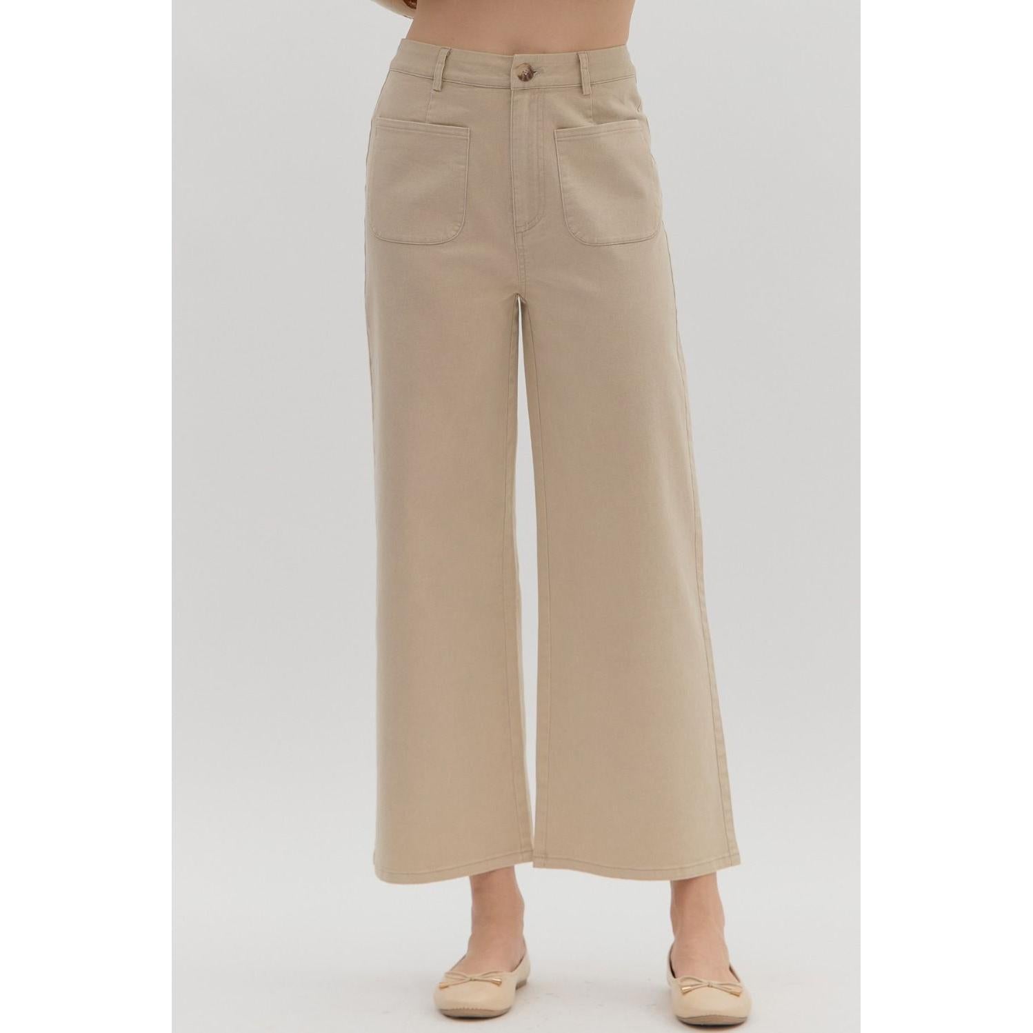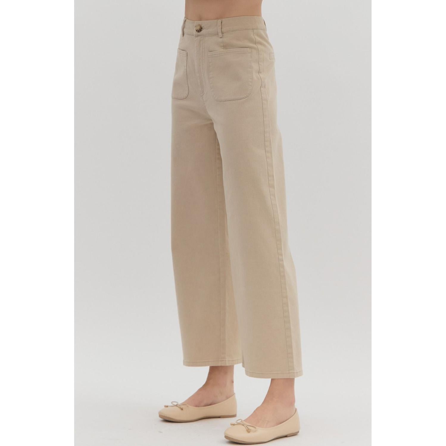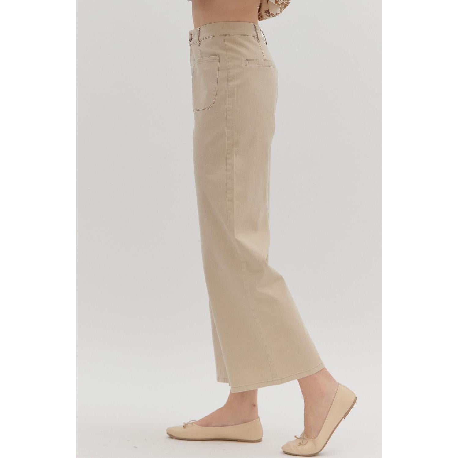 Solid high waisted wide leg ankle length pants featuring patch pockets at front. Faux pocket at back. Belt loops. Button and zipper closure at front. Unlined. Woven. Non-sheer. Lightweight.