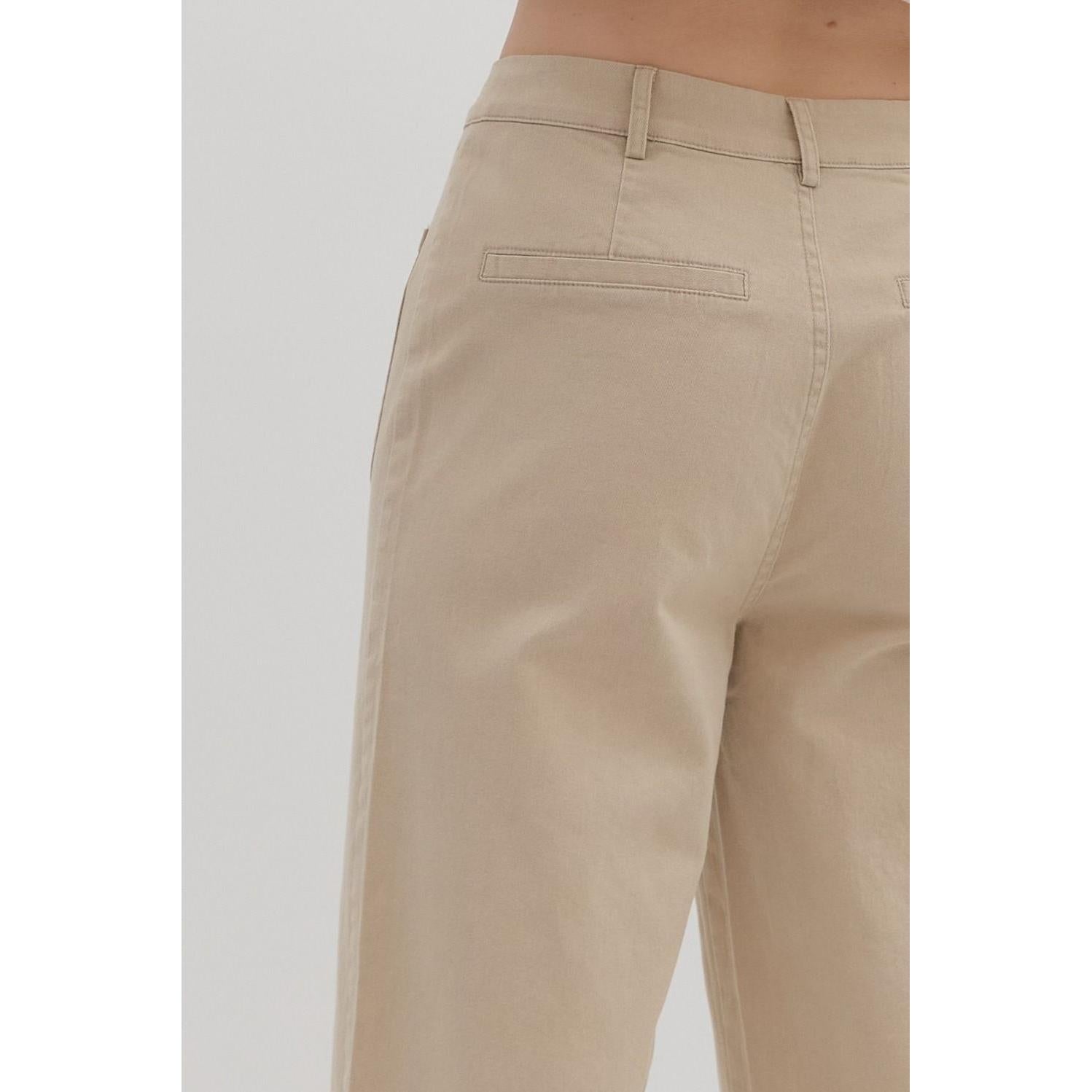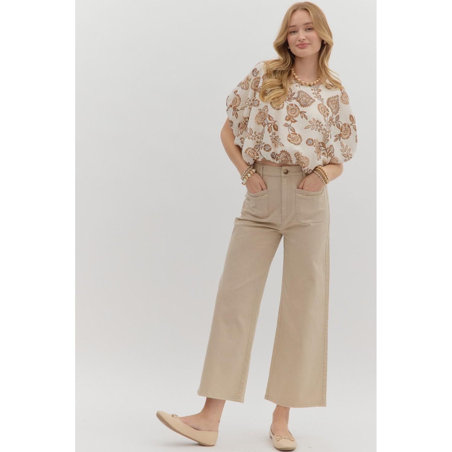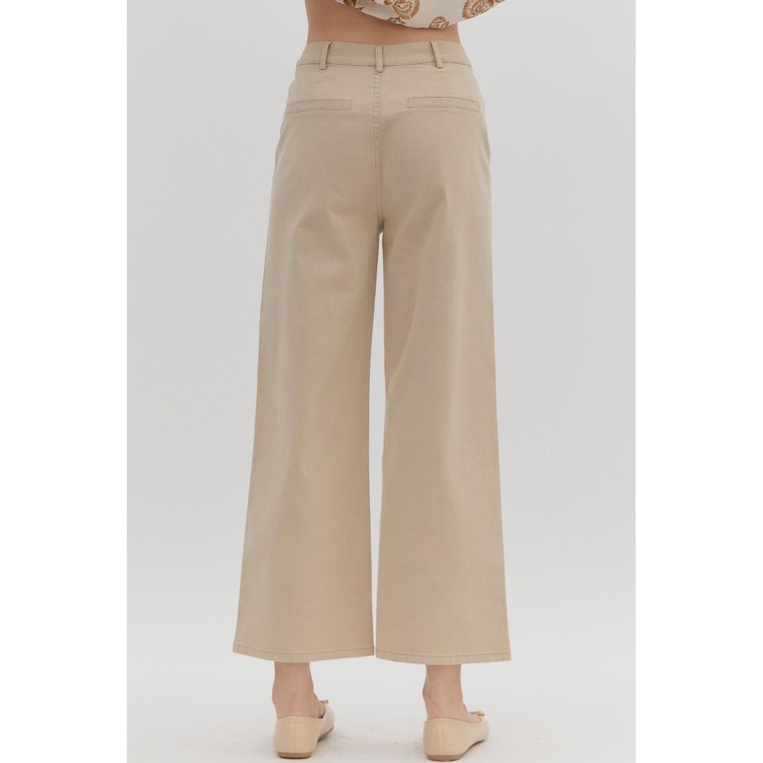 Solid high waisted wide leg ankle length pants featuring patch pockets at front. Faux pocket at back. Belt loops. Button and zipper closure at front. Unlined. Woven. Non-sheer. Lightweight.
