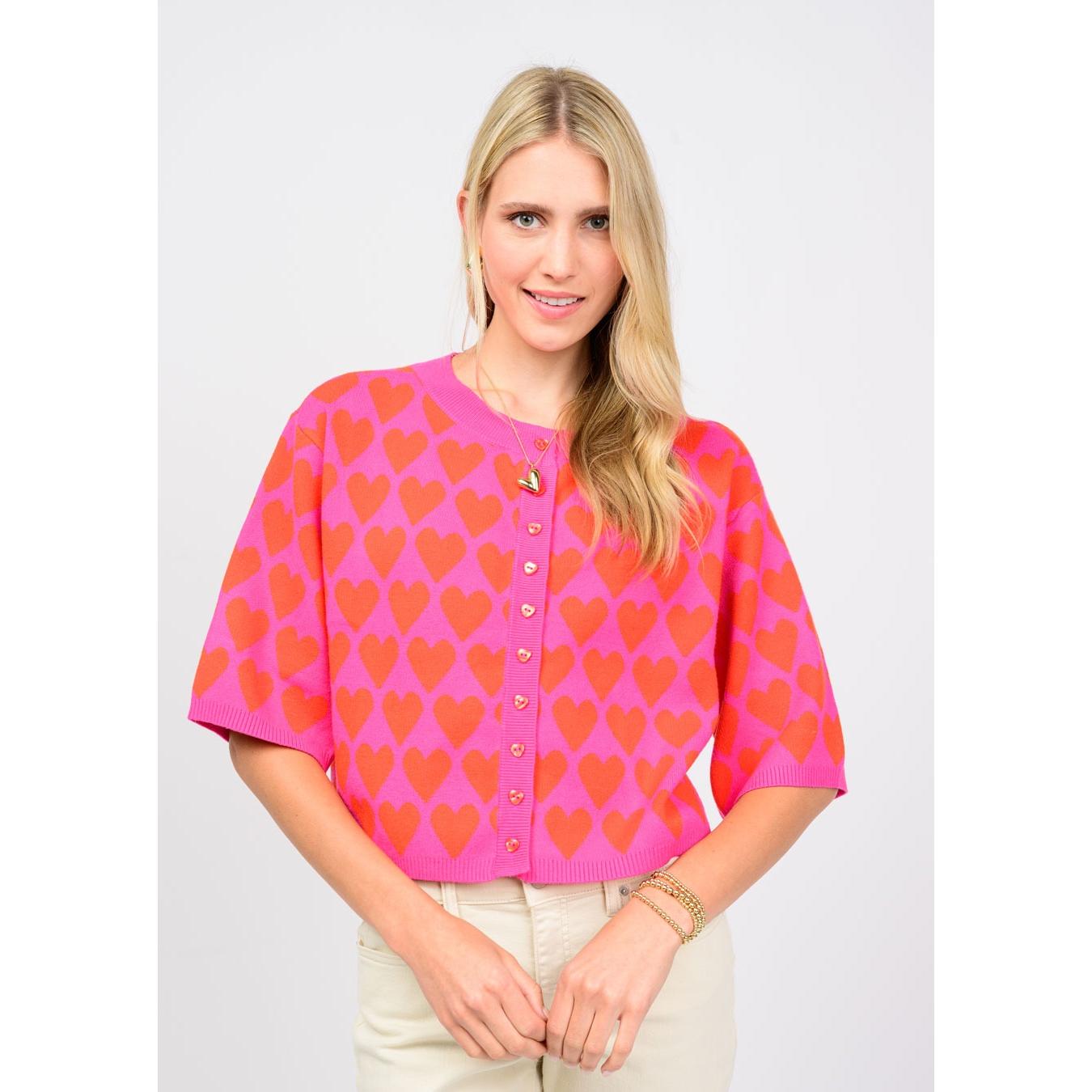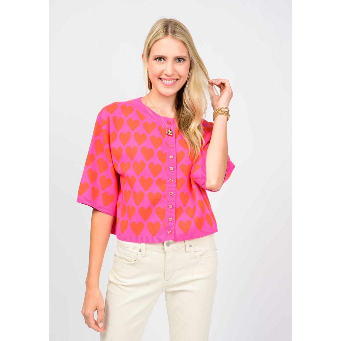Fall in love with cozy charm in Ivy Jane’s Heart Felt Sweater. This vibrant knit features a playful allover heart pattern in bold shades of hot pink and red — a perfect mix of sweet and statement-making. With short sleeves, a relaxed fit, and front button detailing, it’s the ideal piece to layer or wear on its own for effortless style.