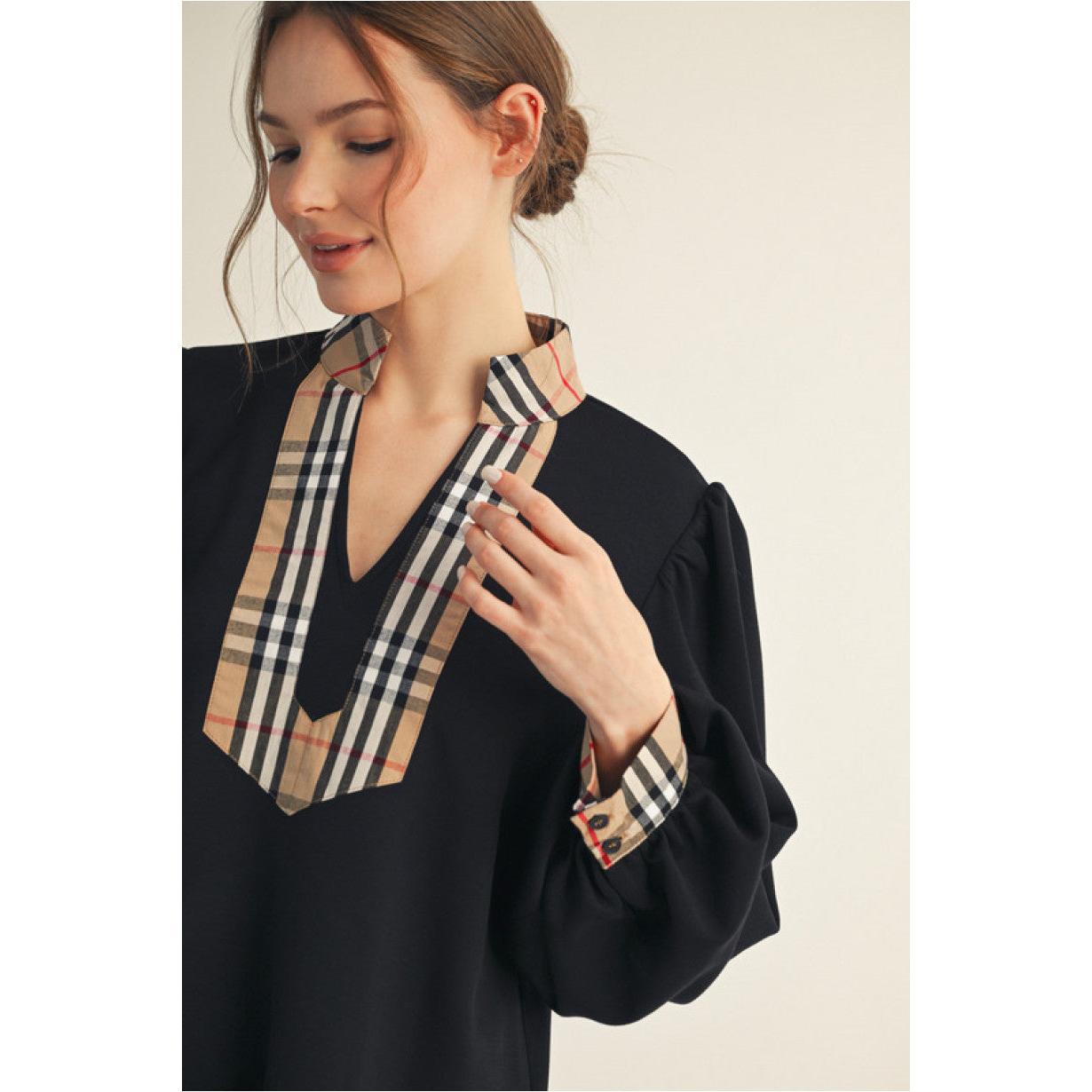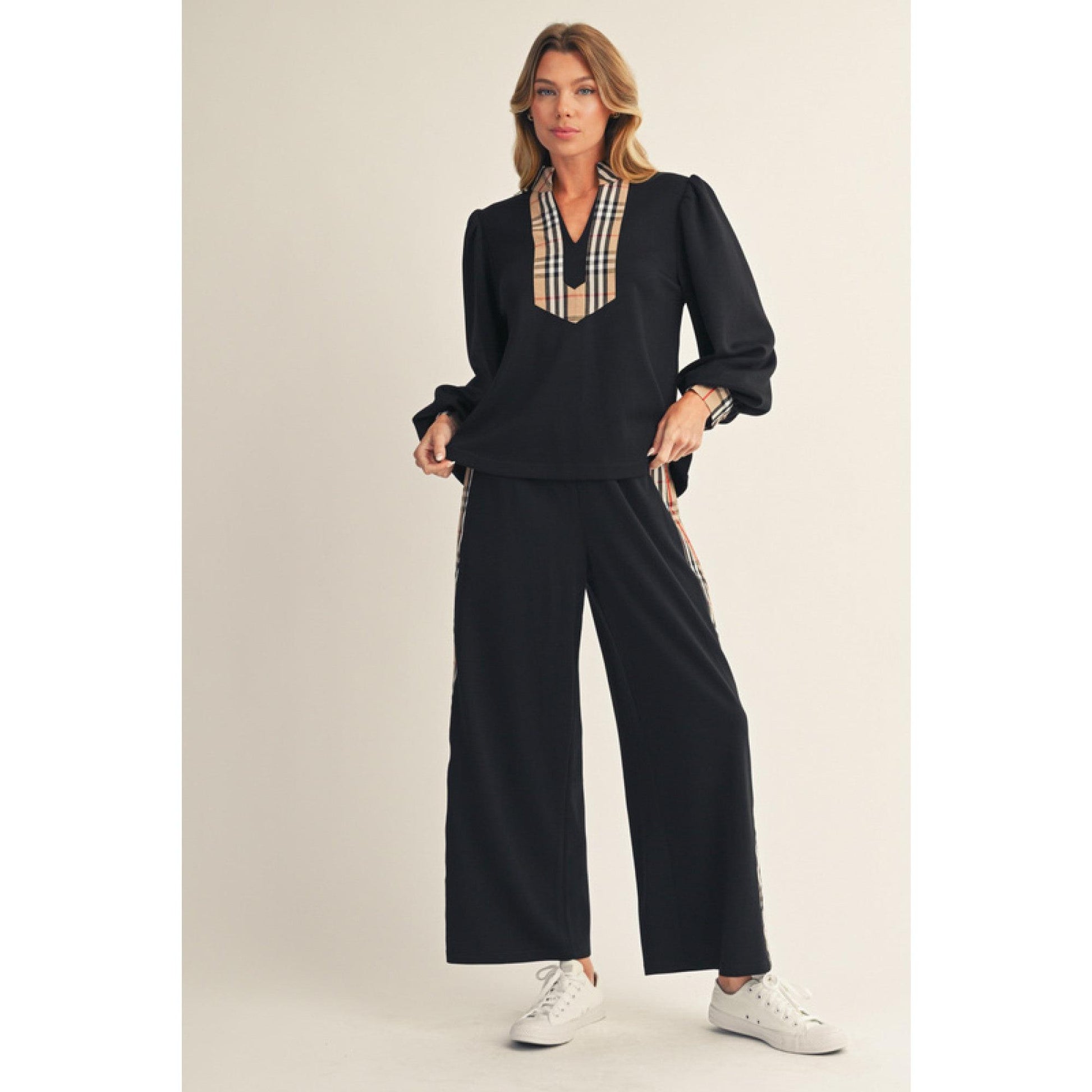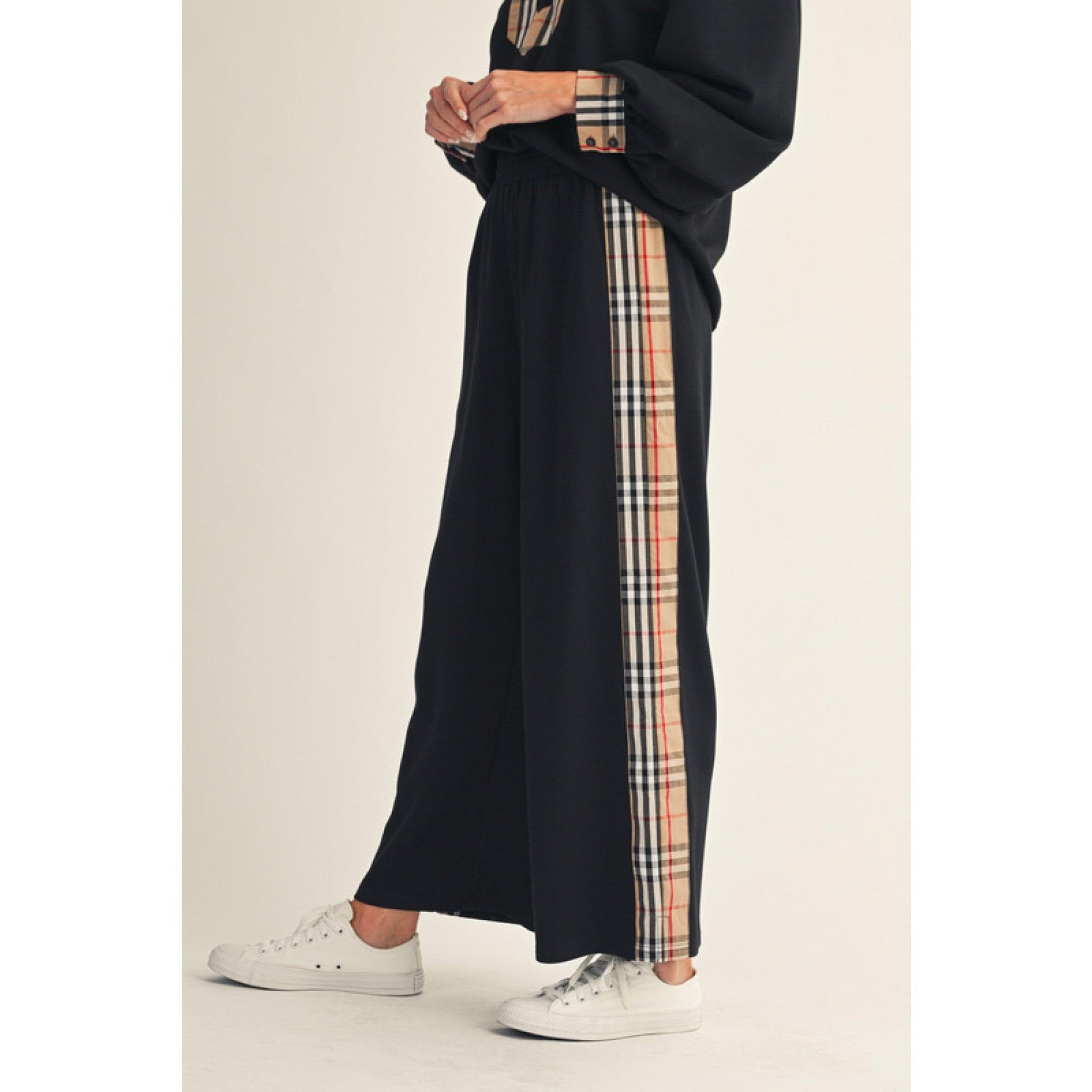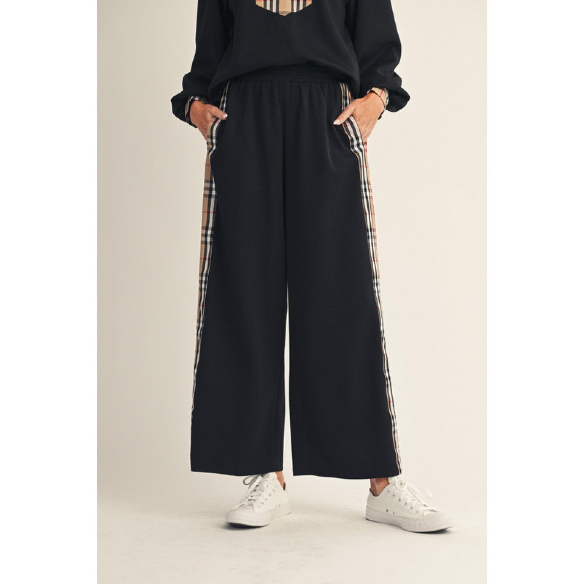 Elastic waist wide leg sweatpants with side plaid contrast accent, side pockets.
