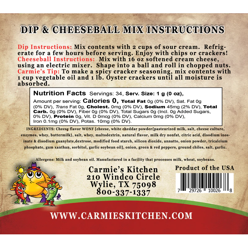 Spicy blend of jalapenos and green chiles pair with cheddar cheese to make one of our most popular dip mixes. Add sour cream or a mixture of sour cream and mayo to create 2 cups of a delicious dip! We recommend serving with potato chips, pretzels, toasted bread slices, or with your favorite vegetables. You can also prepare a cheeseball by adding to 16 oz softened cream cheese. Allergen: dairy. Carmie's dip mixes make the perfect stocking stuffer, hostess gift, holiday gift, or holiday party addition!