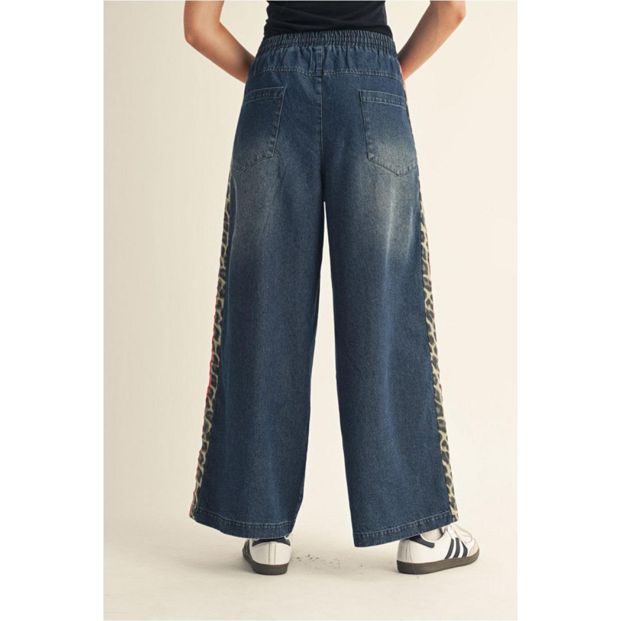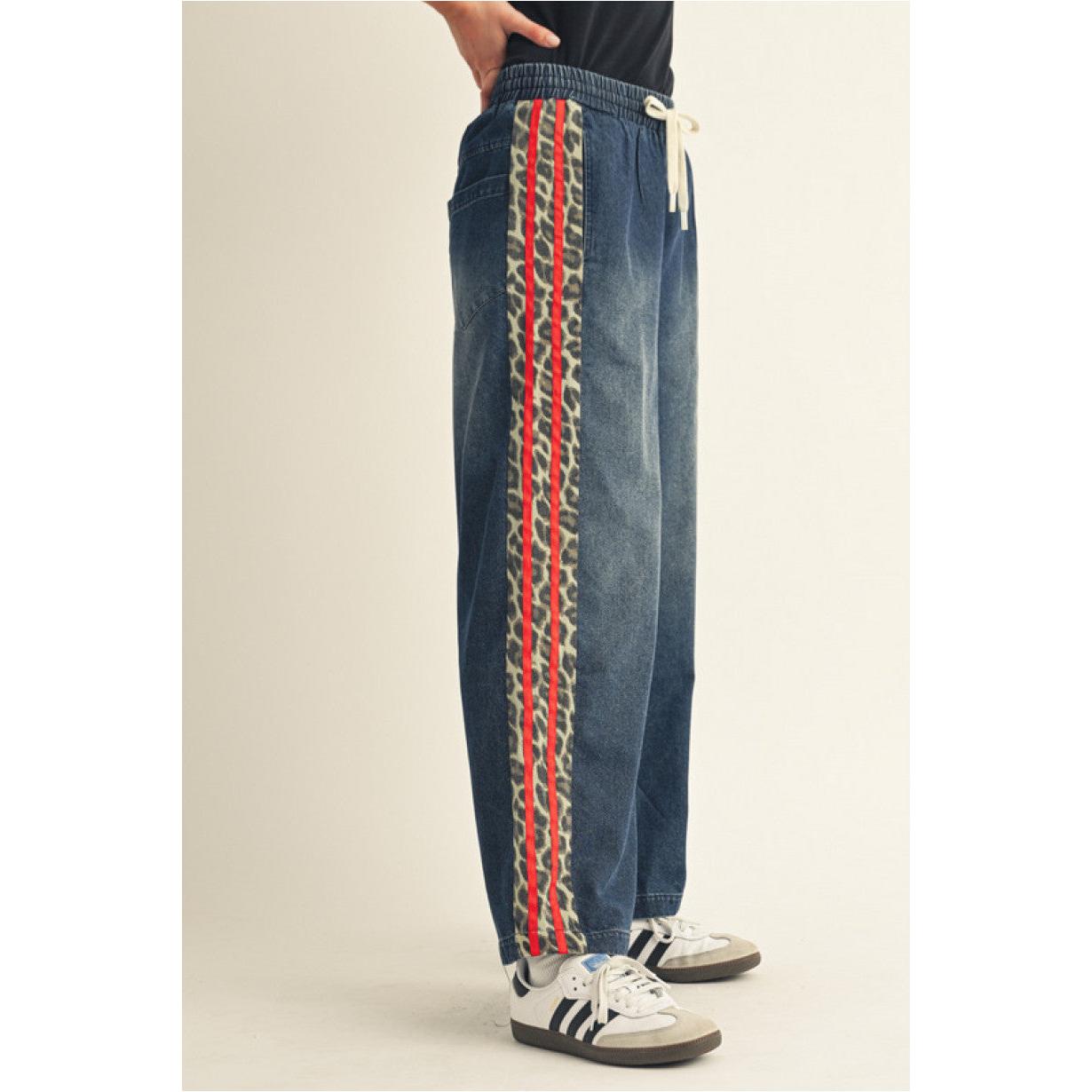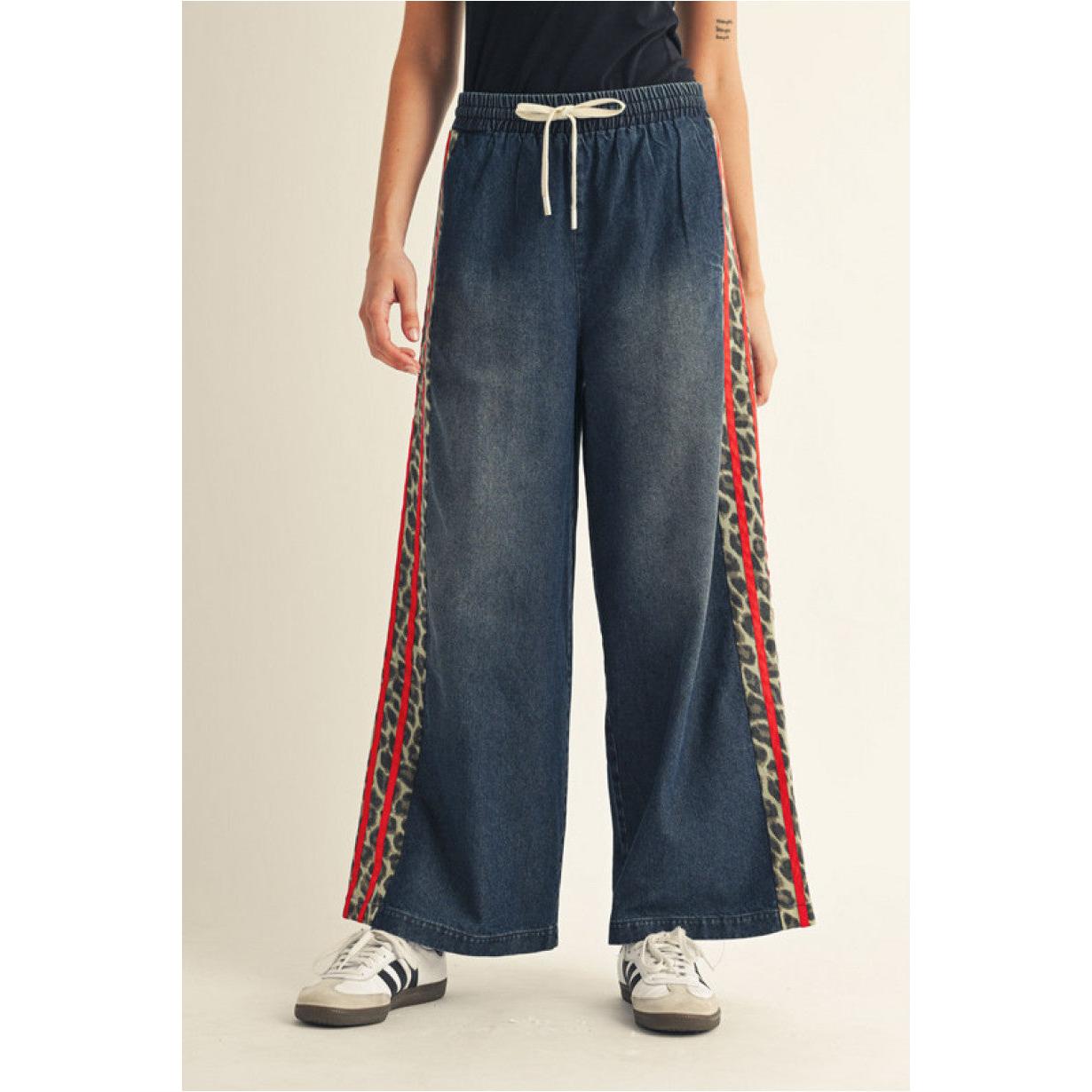 Drawstring waist wide leg casual denim pants, side leopard contrast accent, side pockets.