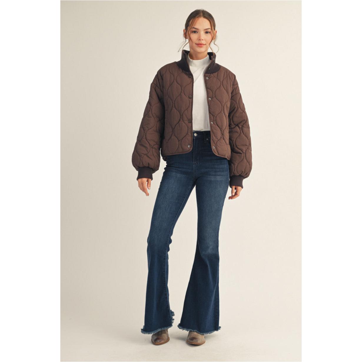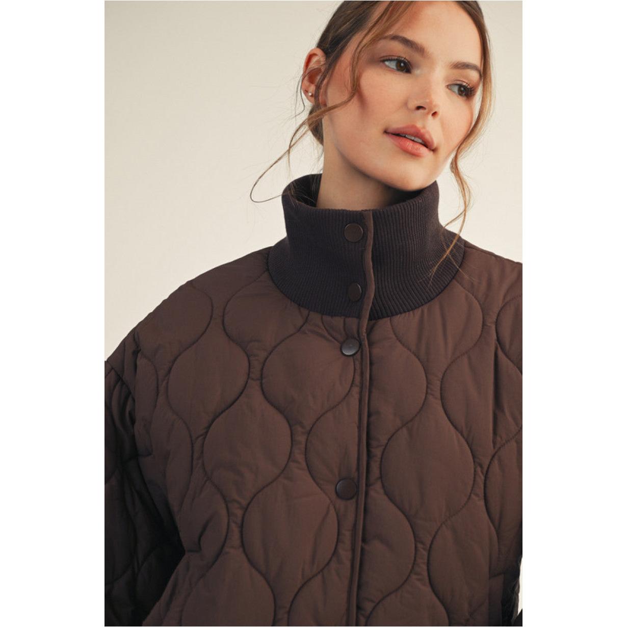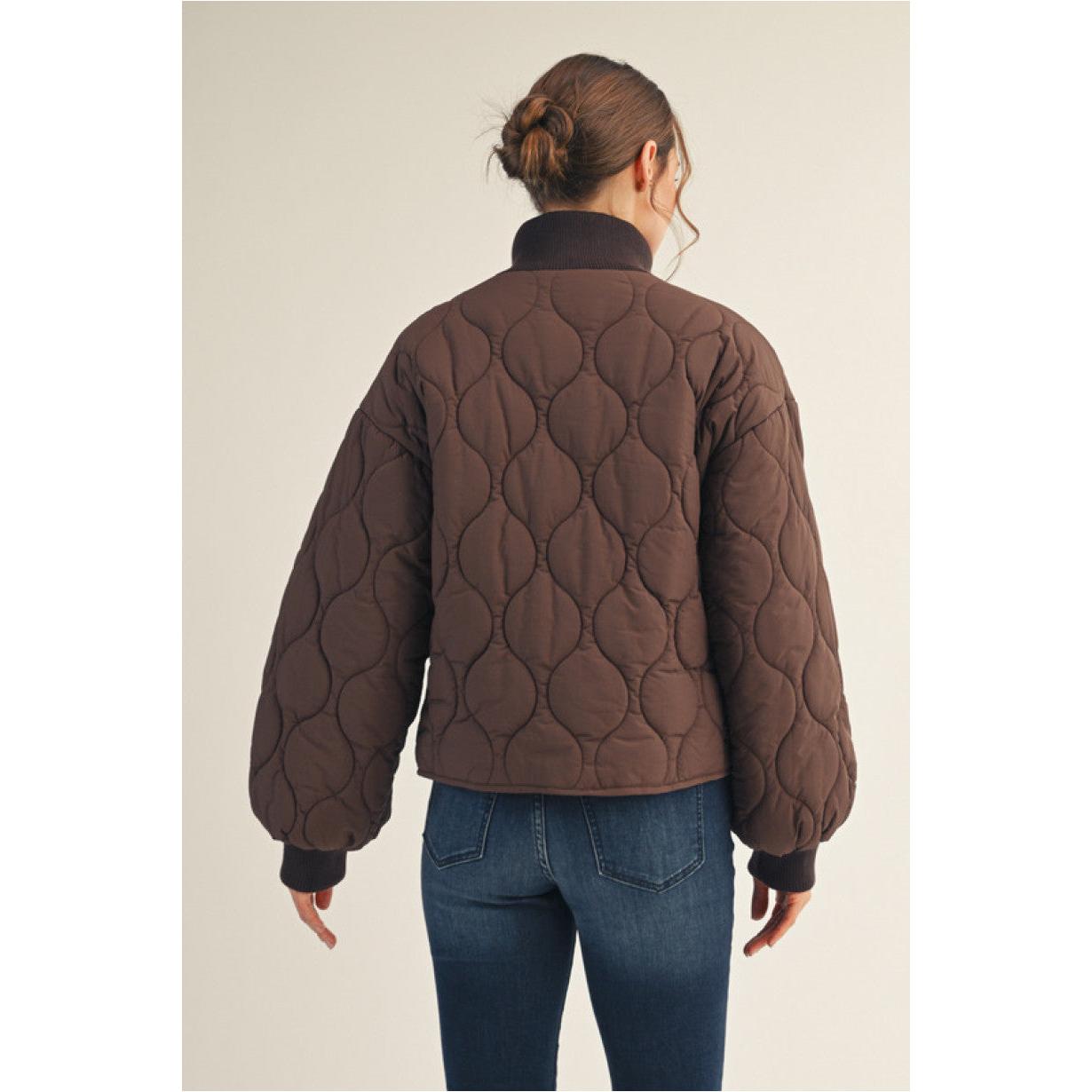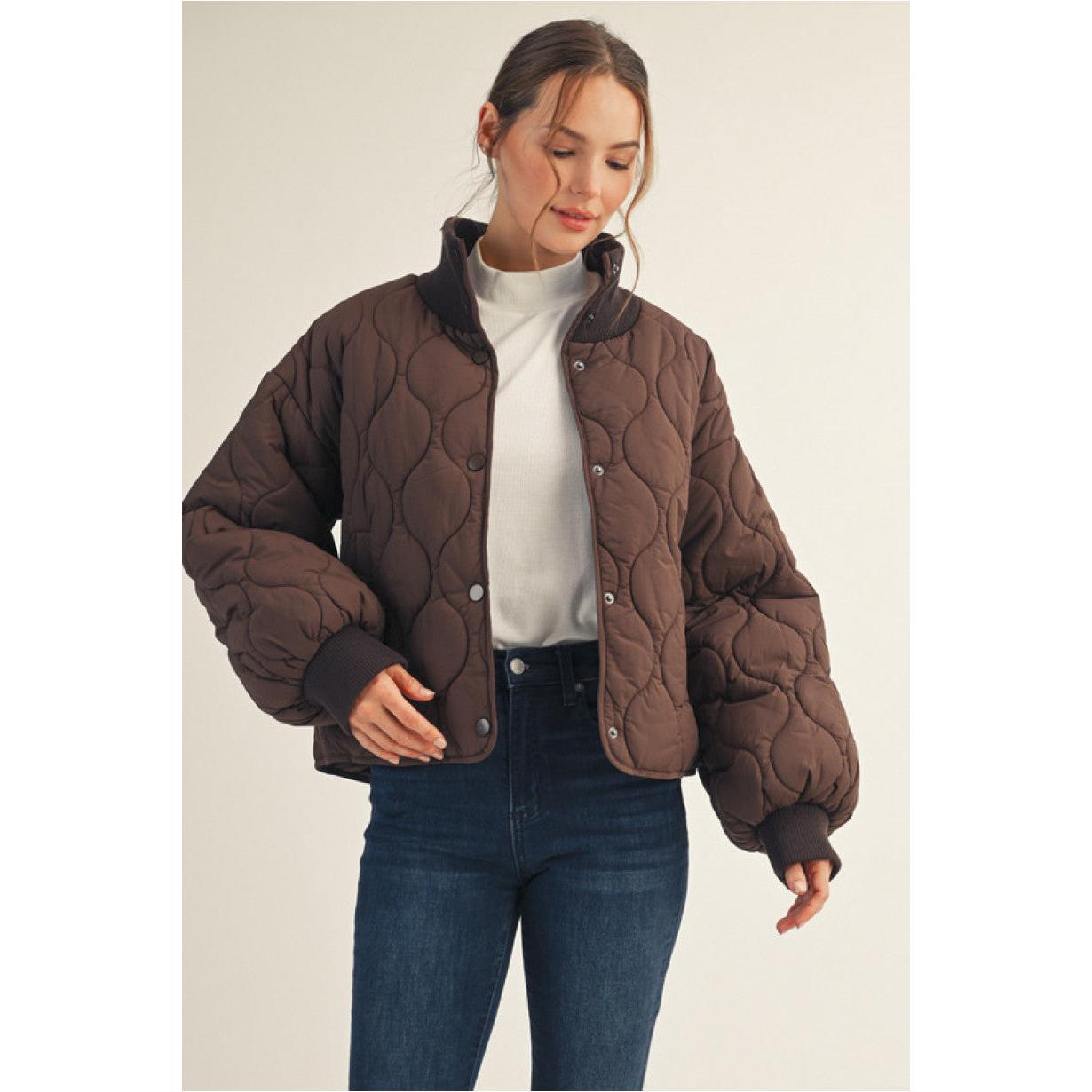 Long puff sleeves button down quilted puffer jacket, high neck, side pockets.