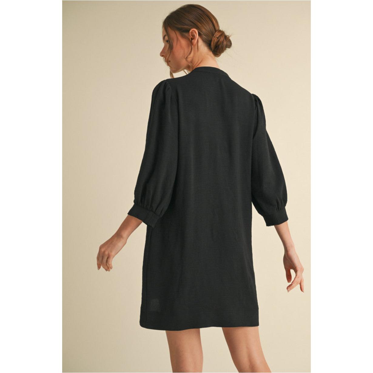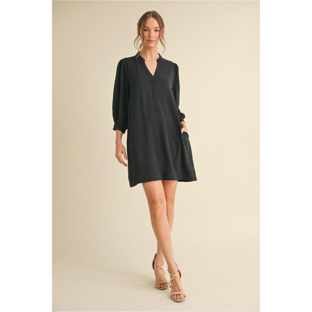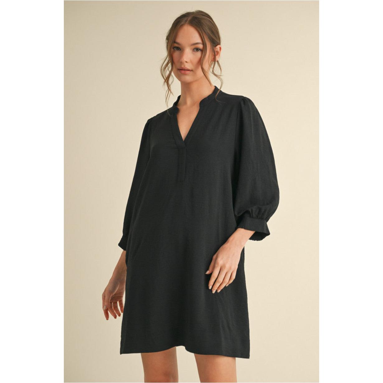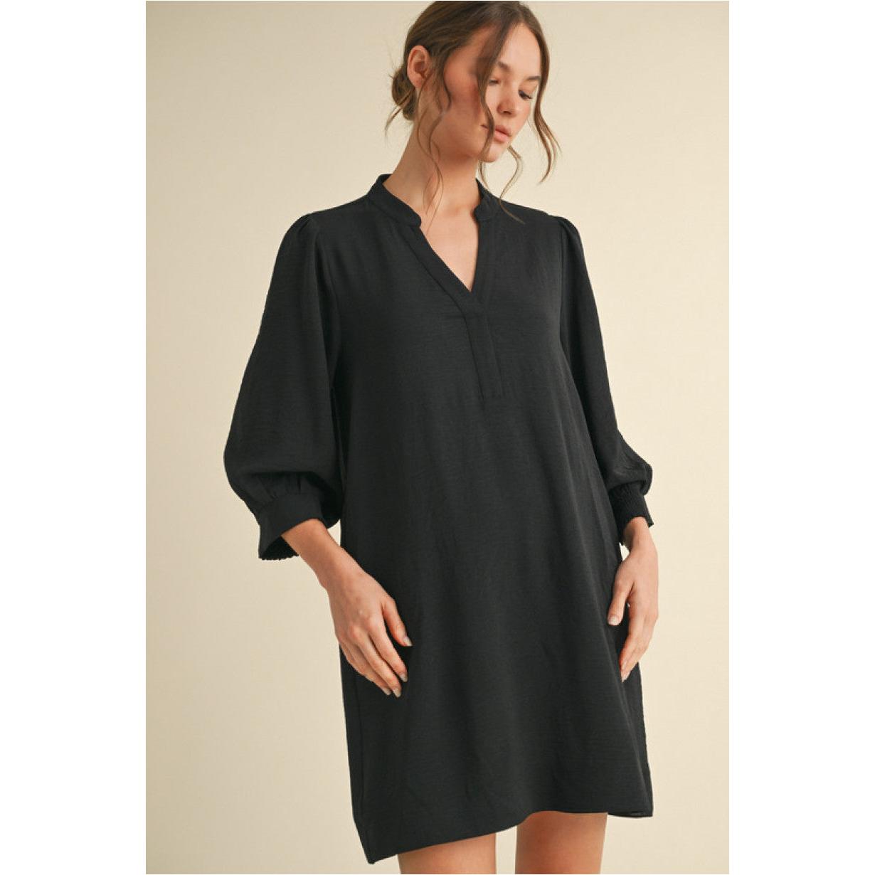 Solid dress with split U-neck, and three quarter peasant sleeves, and band cuffs.