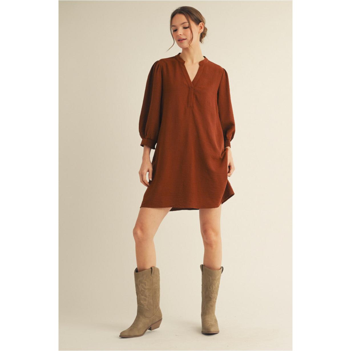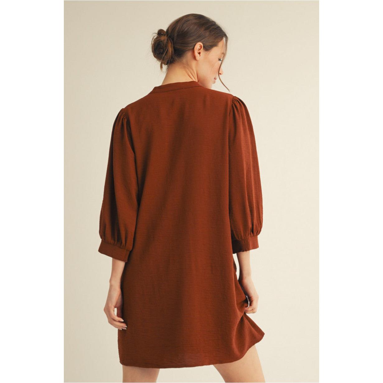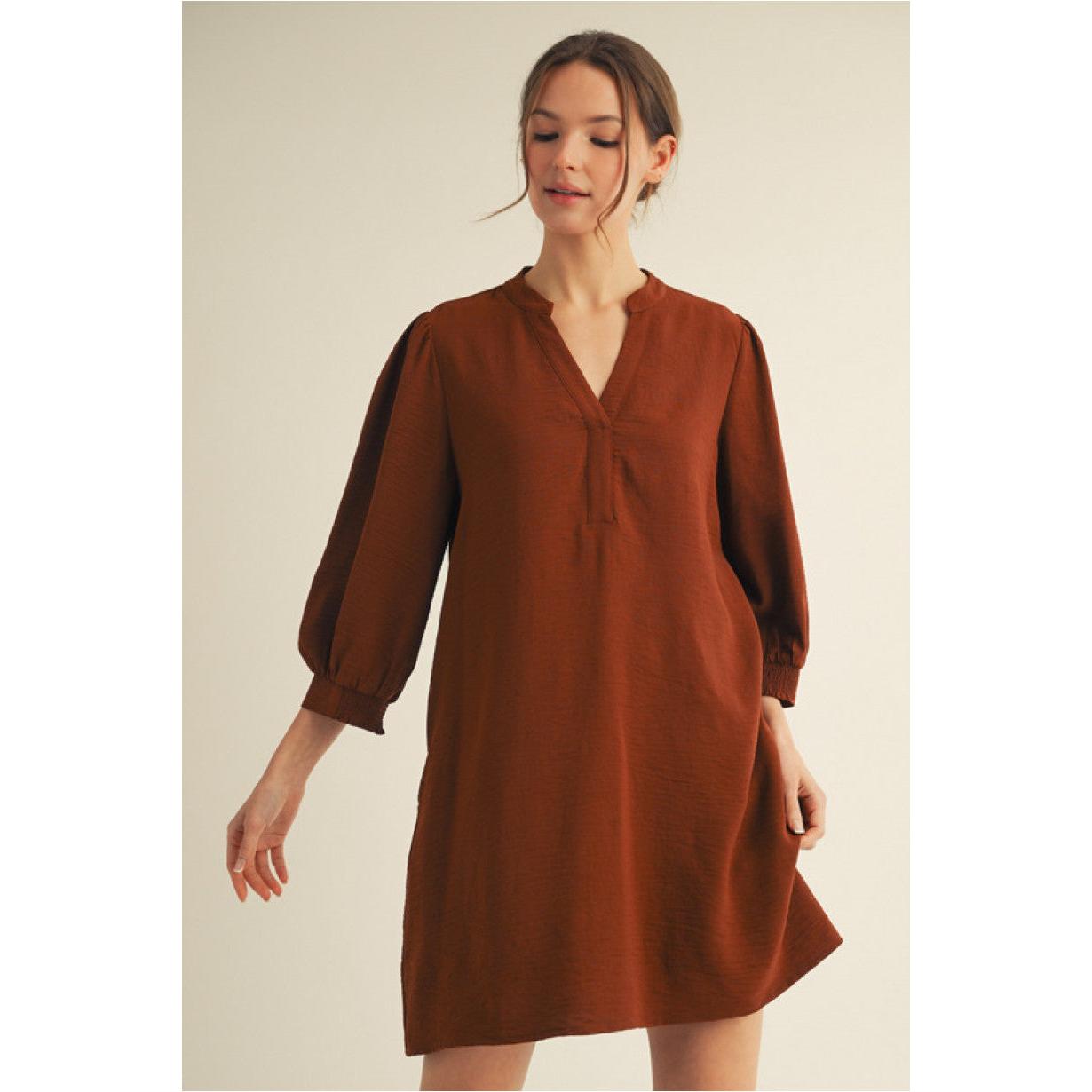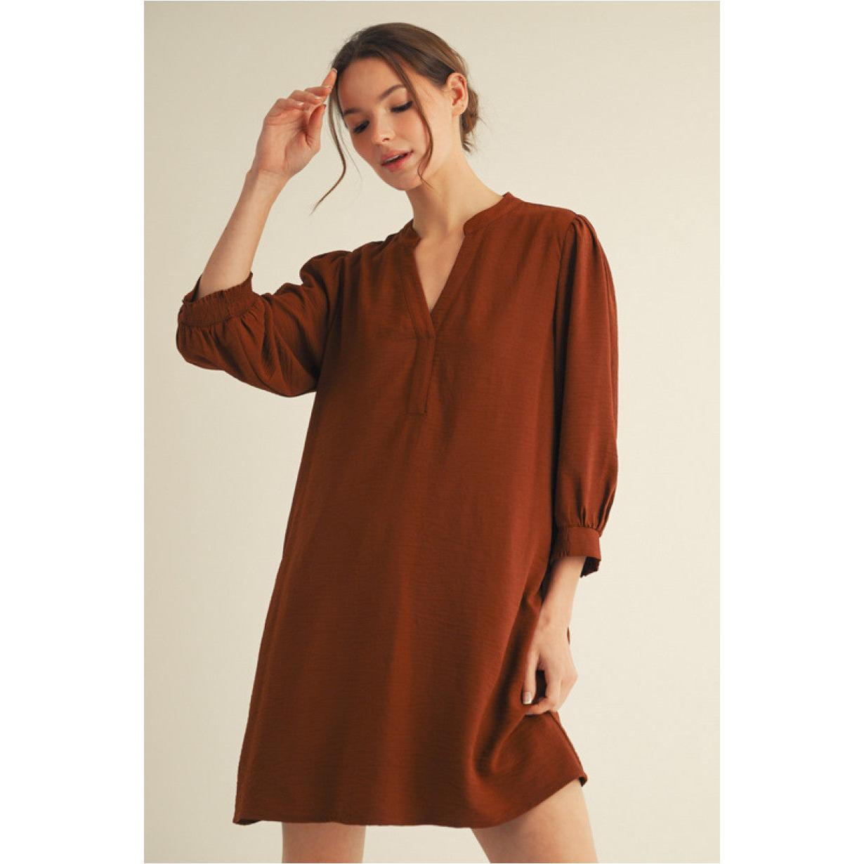 Solid dress with split U-neck, and three quarter peasant sleeves, and band cuffs.