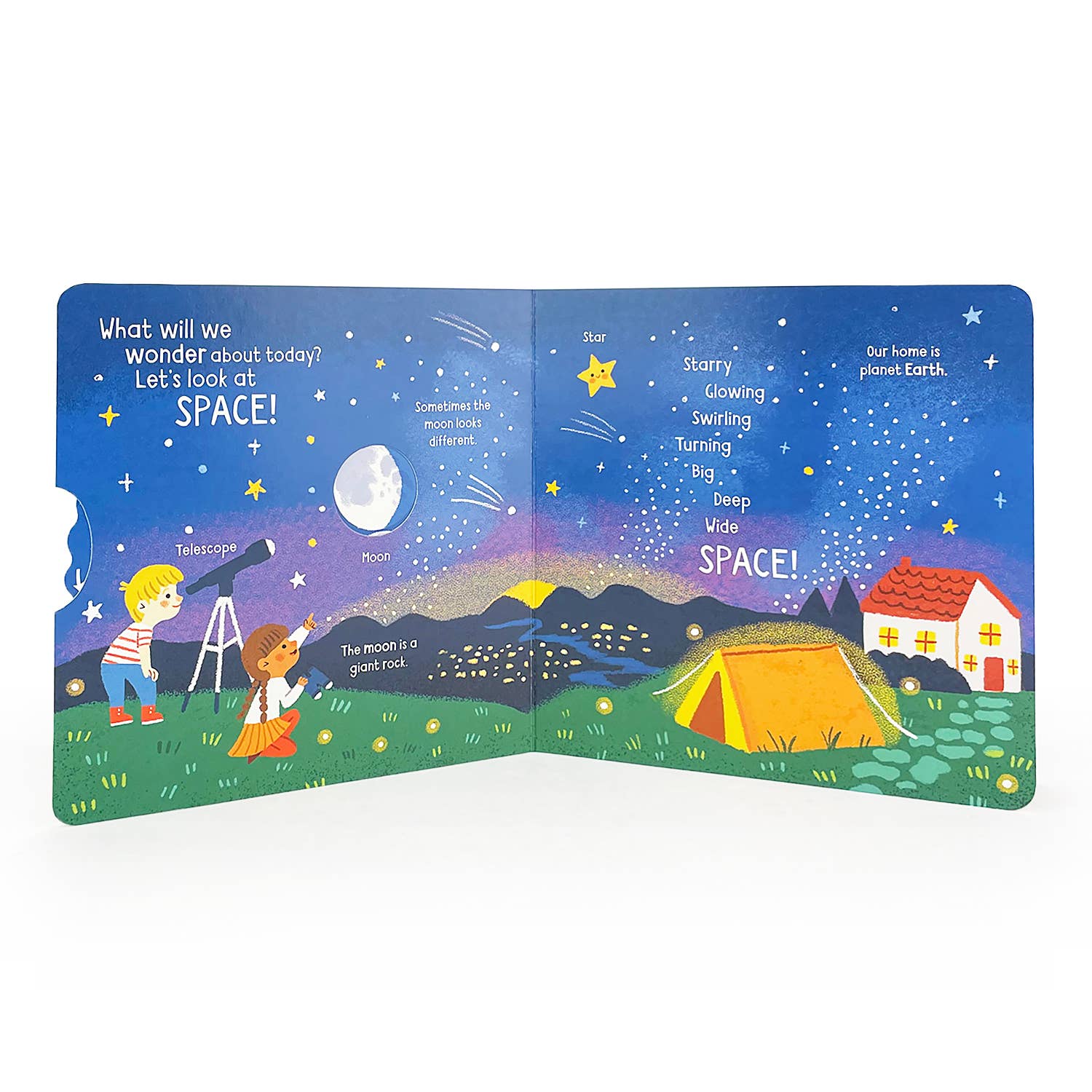 Your little one is full of wonder! Especially about swirling, whirling, starry, VAST space! Through easy facts and explanations designed specifically for young kids, they'll learn about stars, planets, the sun and moon, and how important they all are to our world. Durable board book pages: easy for little toddler hands to grasp, great for boys and girls practicing fine motor skills, and will withstand traditional wear and tear. Multi-activity: flaps, wheels, tabs, and more will encourage engagement and fine motor development for little learners.