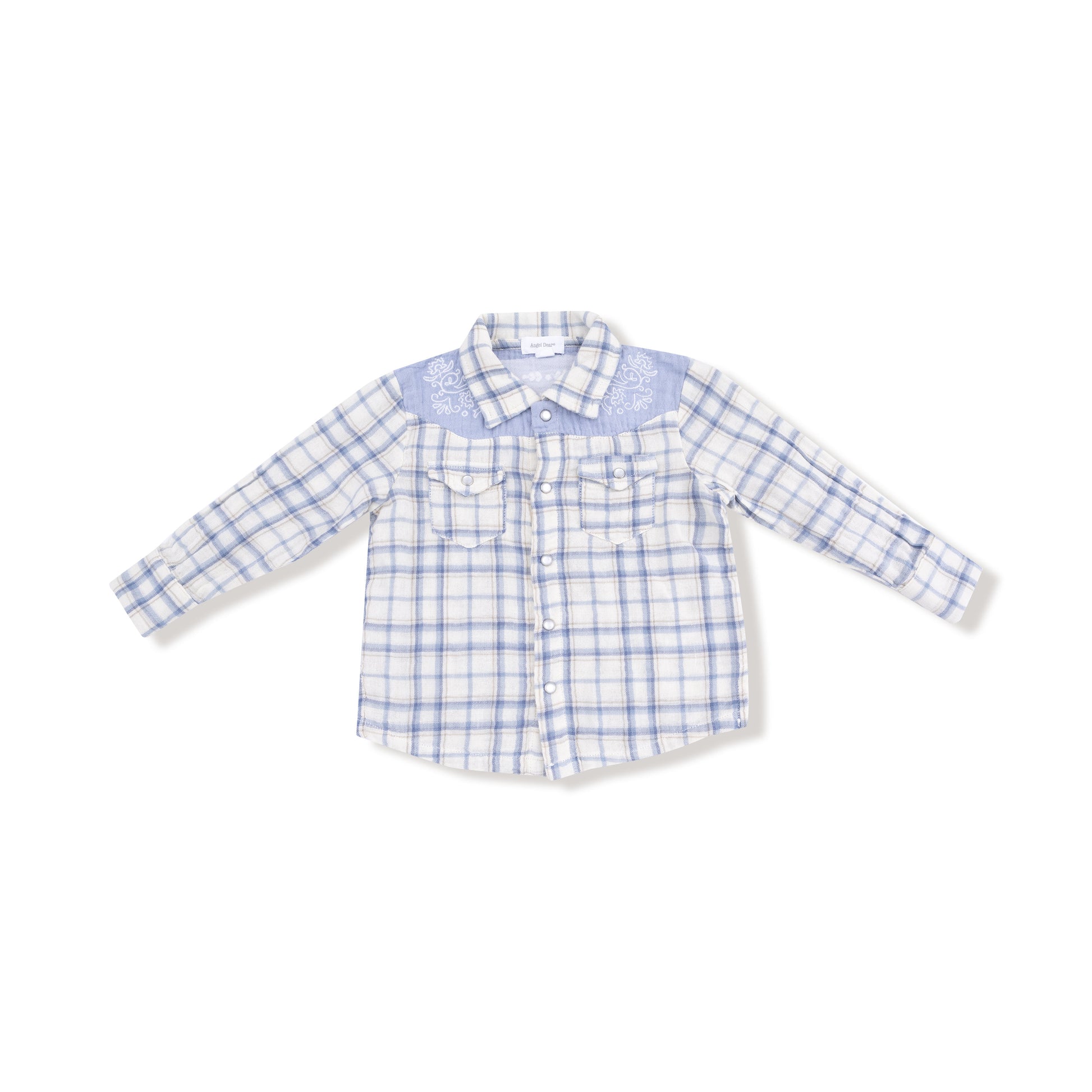 Bring a little cowboy charm to chilly days with our Long Sleeve Western Pearl Snap Shirt, crafted from soft organic cotton muslin. Featuring classic pearl snaps and a bold “Howdy” embroidery on the back, this shirt is perfect for your little wrangler’s fall and winter adventures.