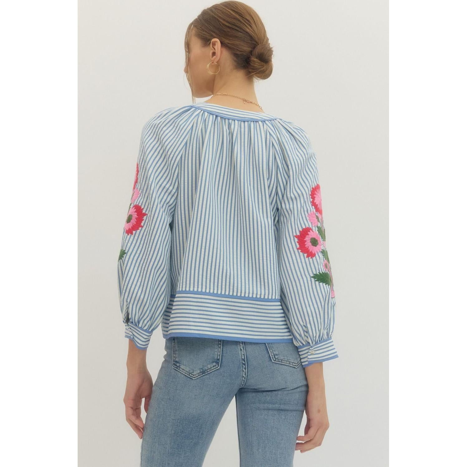 The Maribelle Embroidered Top blends classic stripes with beautiful floral details for a look that's effortlessly feminine. Featuring a band collar V-neckline with contrast binding, this top adds a polished touch while keeping things lightweight and easy.