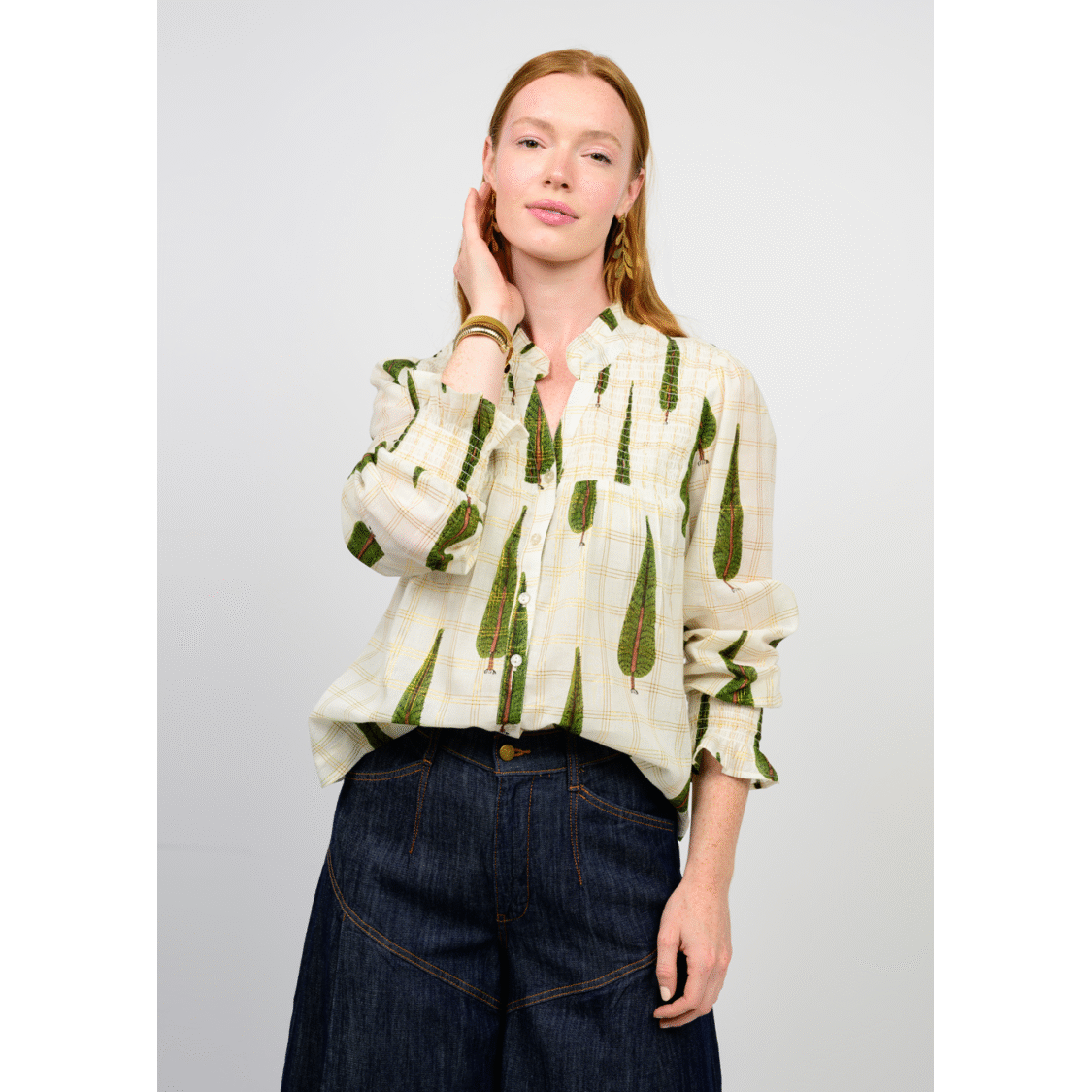 Designed with a relaxed silhouette, gentle gathers at the yoke, and a button-front neckline, it offers effortless style and comfort. The metallic threading woven throughout the plaid adds just the right amount of shimmer for seasonal gatherings, Christmas in Crockett, or any cozy winter day.