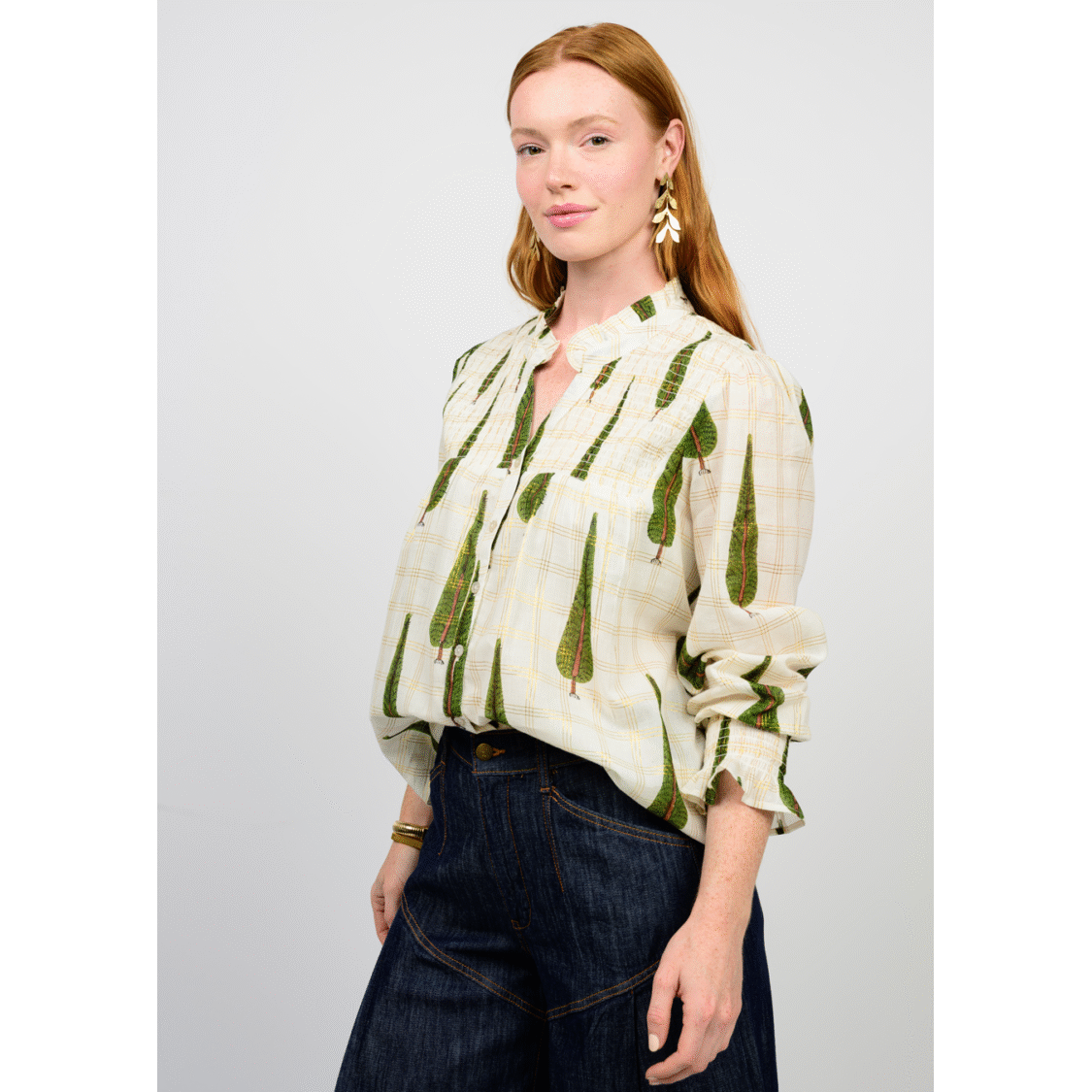 Bring a touch of festive charm to your wardrobe with this whimsical Metallic Plaid Tree Top by Ivy Jane. Featuring a soft cream base with a subtle plaid pattern, this blouse stands out with its embroidered evergreen tree motif—playful, unique, and perfect for the holiday season.