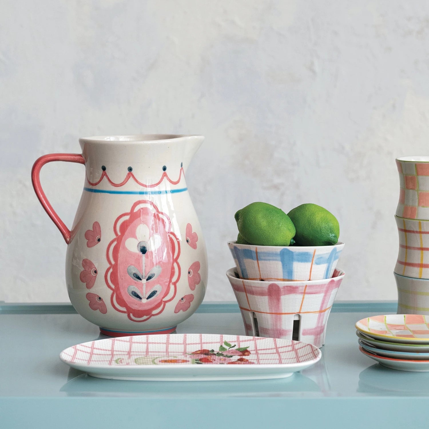 This Stoneware Pitcher is a celebration of craftsmanship and design, featuring a lovely floral pattern that wraps around its surface and a vibrant red handle for a pop of color. The spout is expertly crafted for smooth pouring, while the wide opening allows for easy filling and cleaning. With dimensions of 8.5 inches in length and 9.5 inches in height, it's an ideal vessel for serving various beverages or showcasing fresh flowers. Its multi-hued palette and timeless design make it a versatile piece that complements a variety of decor styles, from the simplicity of Scandinavian to the warmth of Boho to the rustic elegance of French country. This pitcher is not only functional but also adds a touch of elegance to any table setting or room.