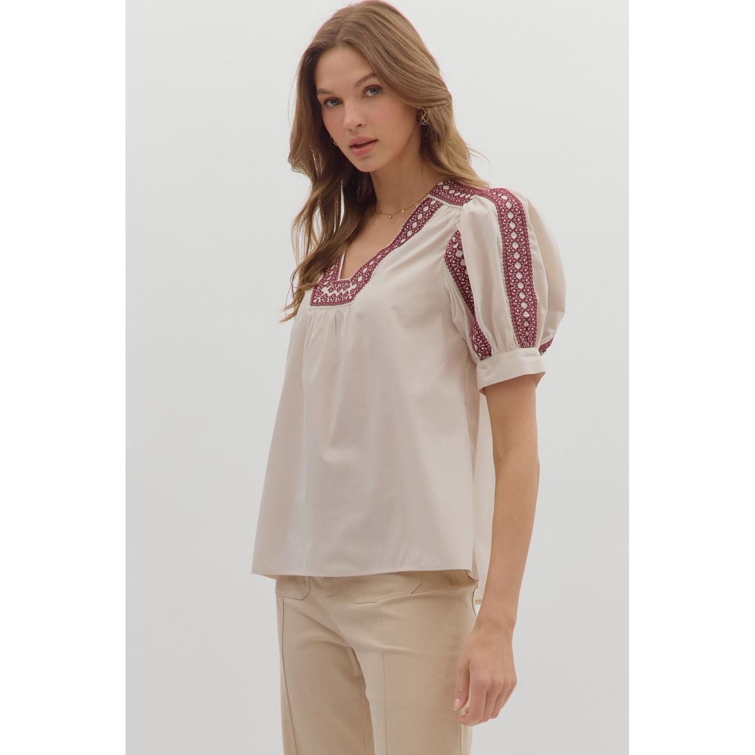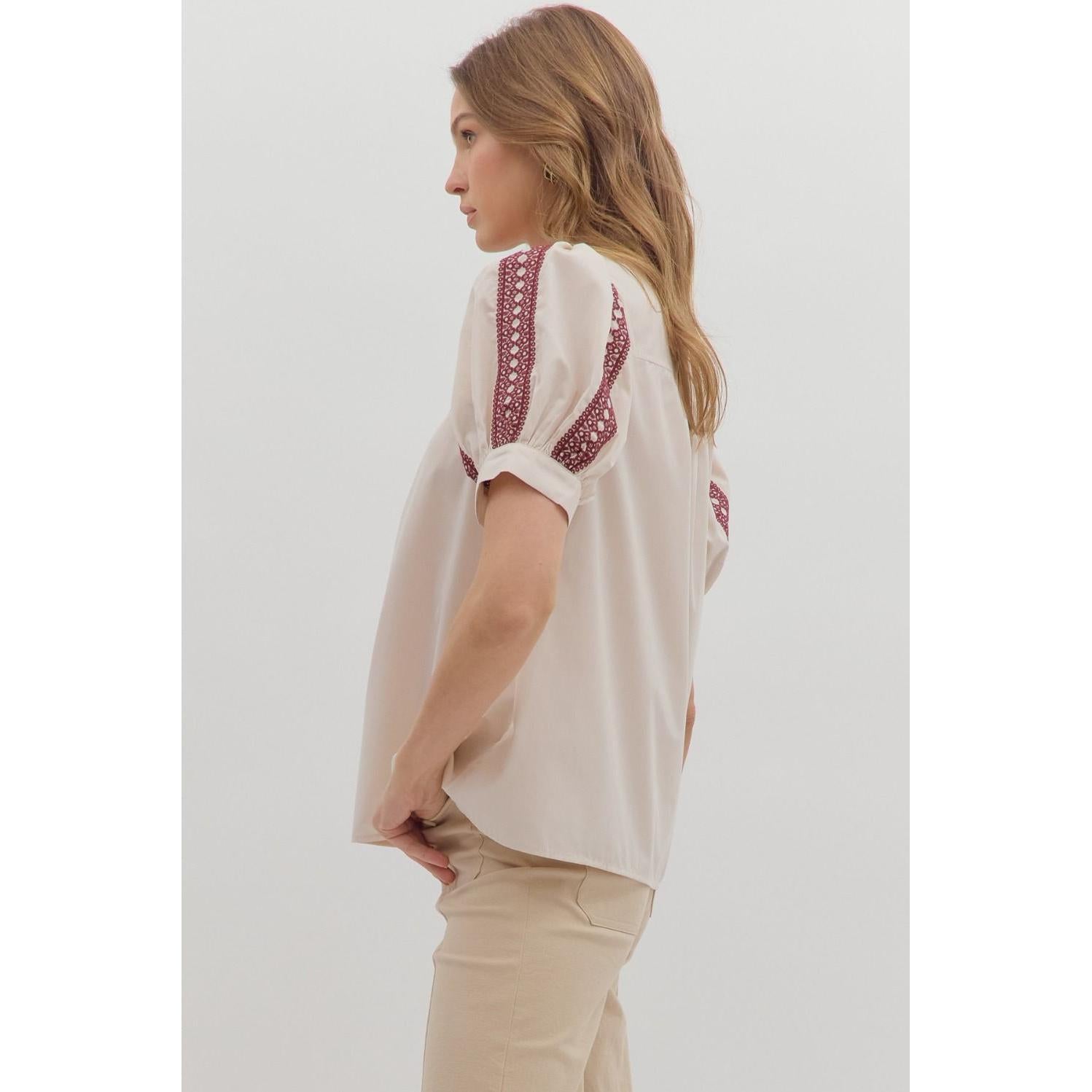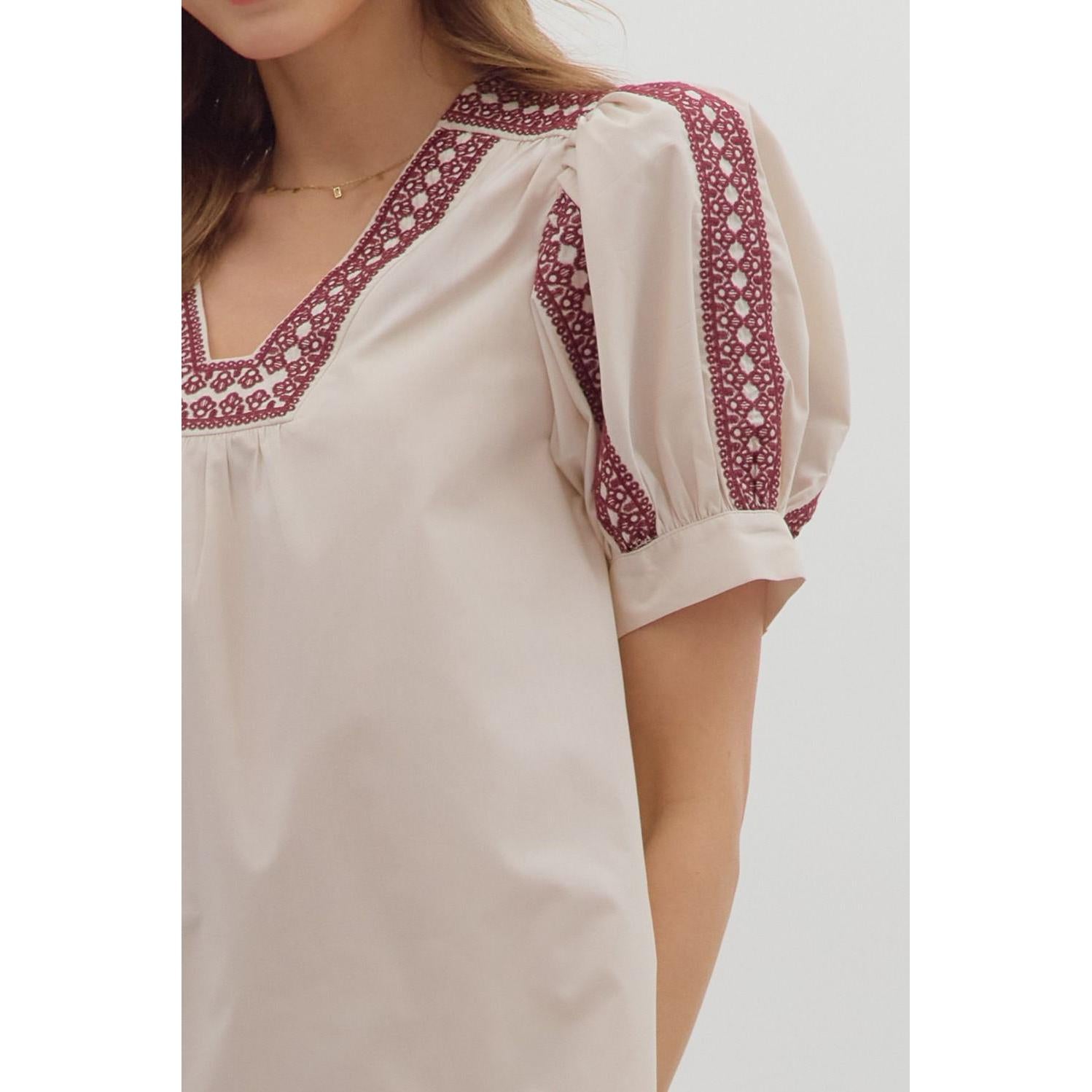 Solid cuff band short puff sleeve top featuring abstract pattern embroidery at neckline and sleeves. Unlined. Woven. Non-sheer. Lightweight.