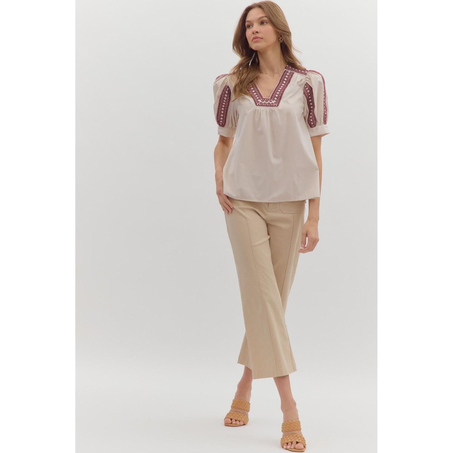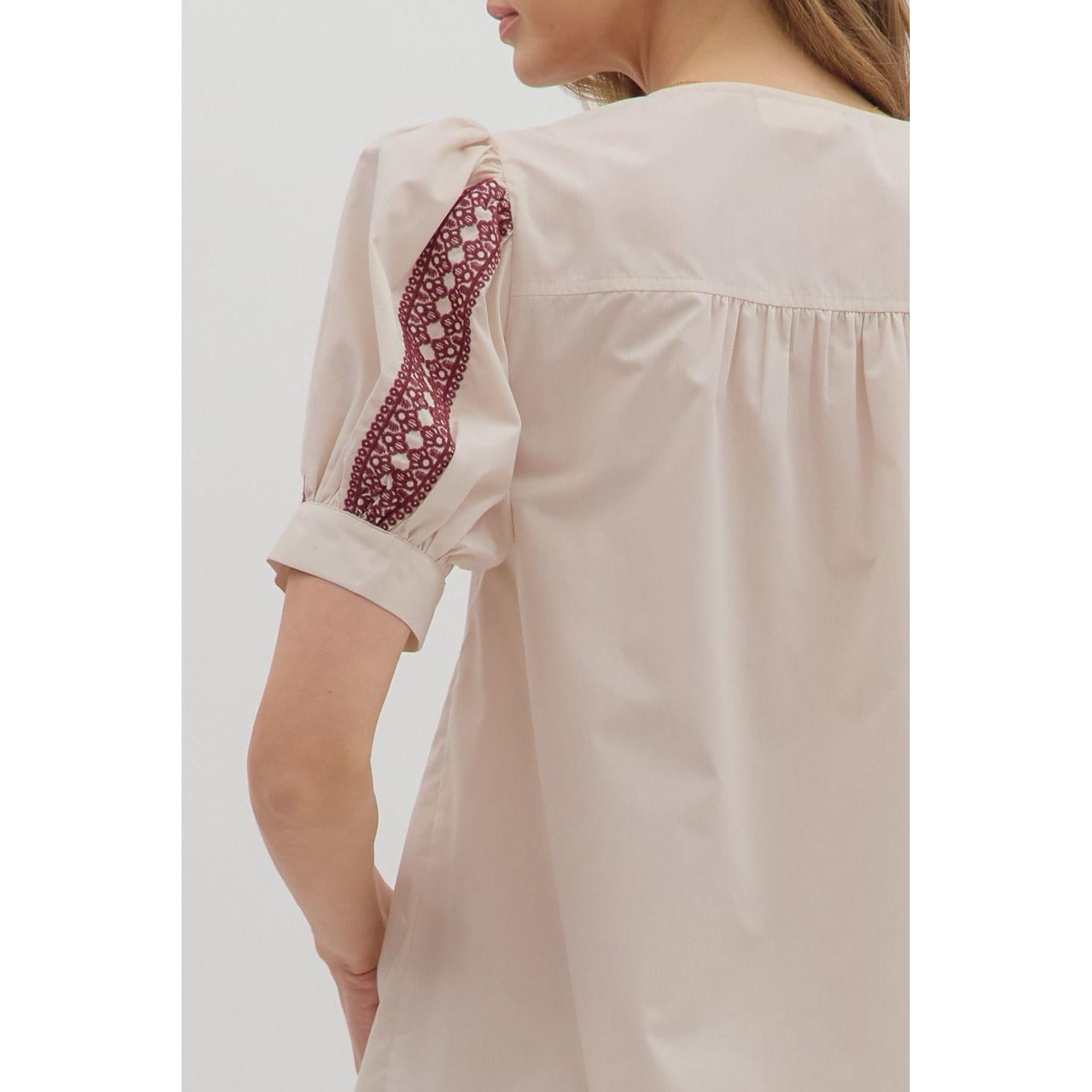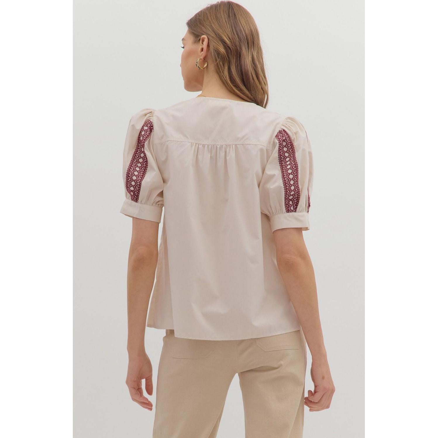 Solid cuff band short puff sleeve top featuring abstract pattern embroidery at neckline and sleeves. Unlined. Woven. Non-sheer. Lightweight.