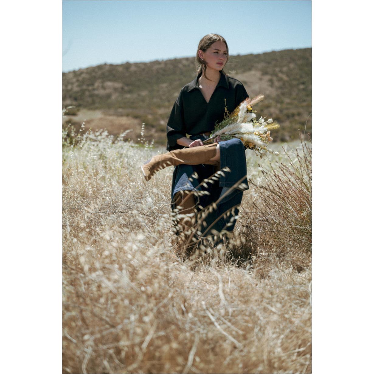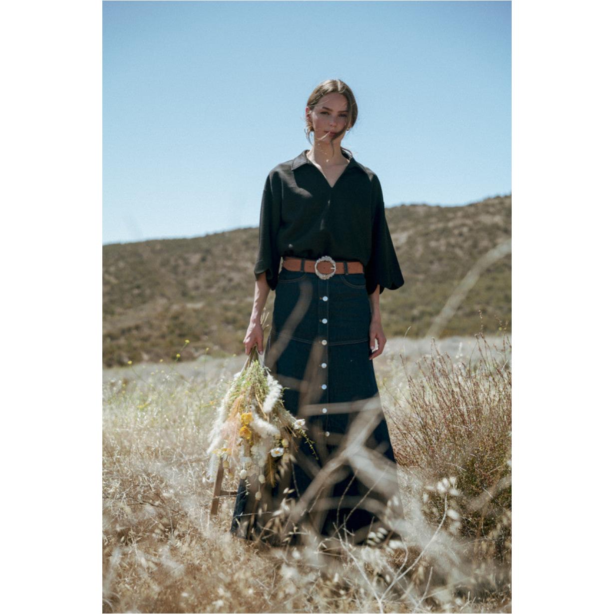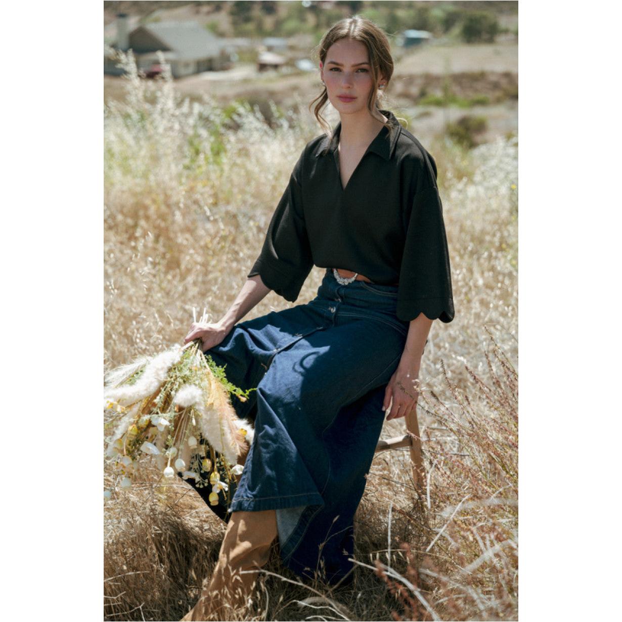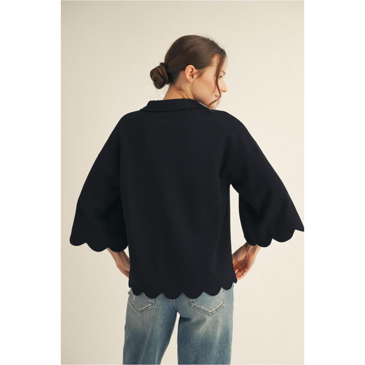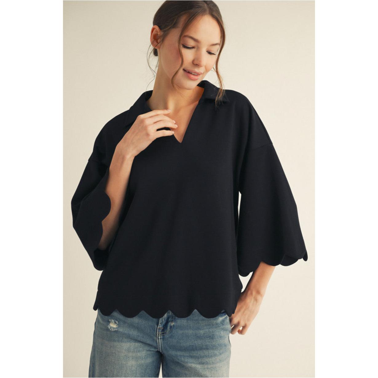 3/4 sleeves v neck top with scallop edge detail, collared neckline.