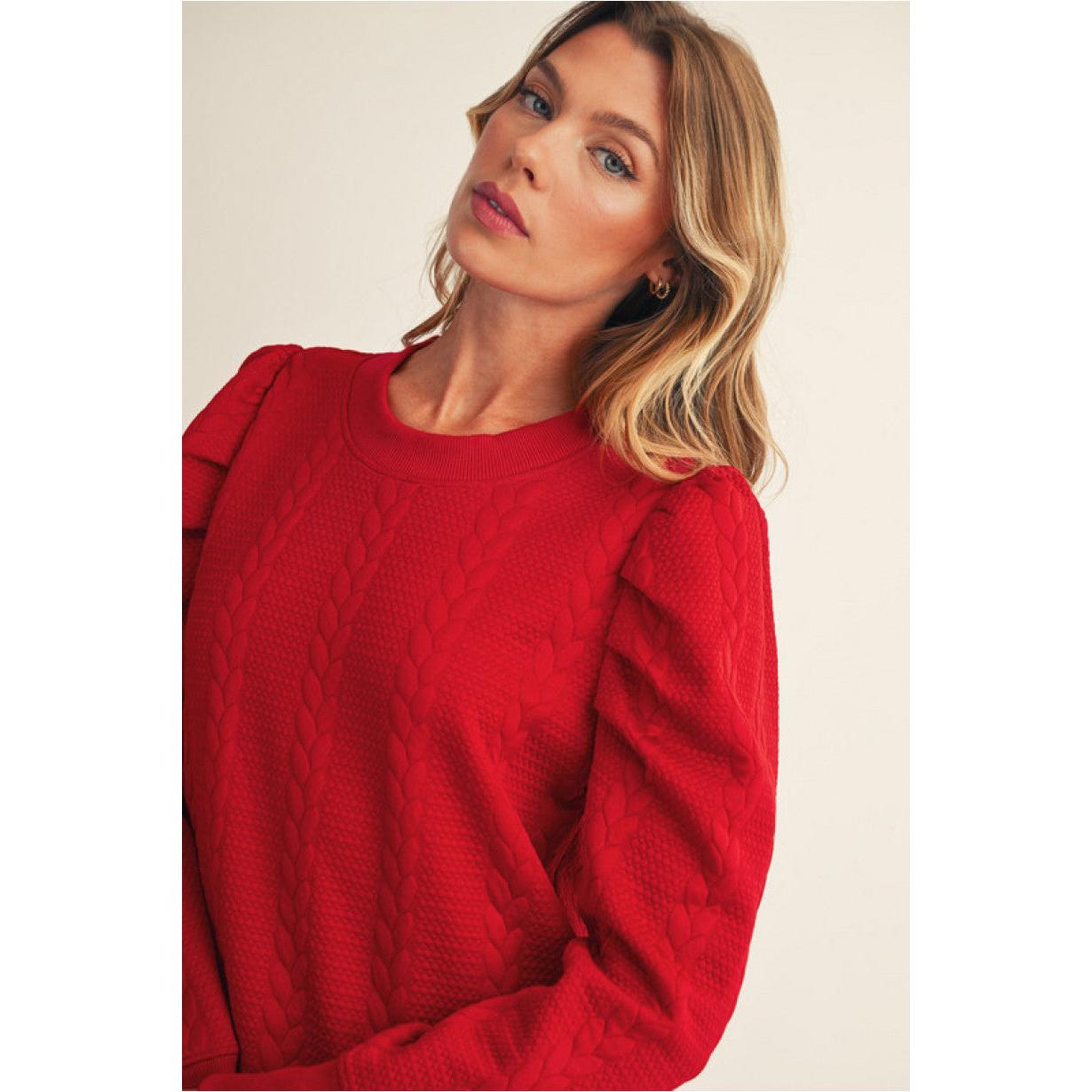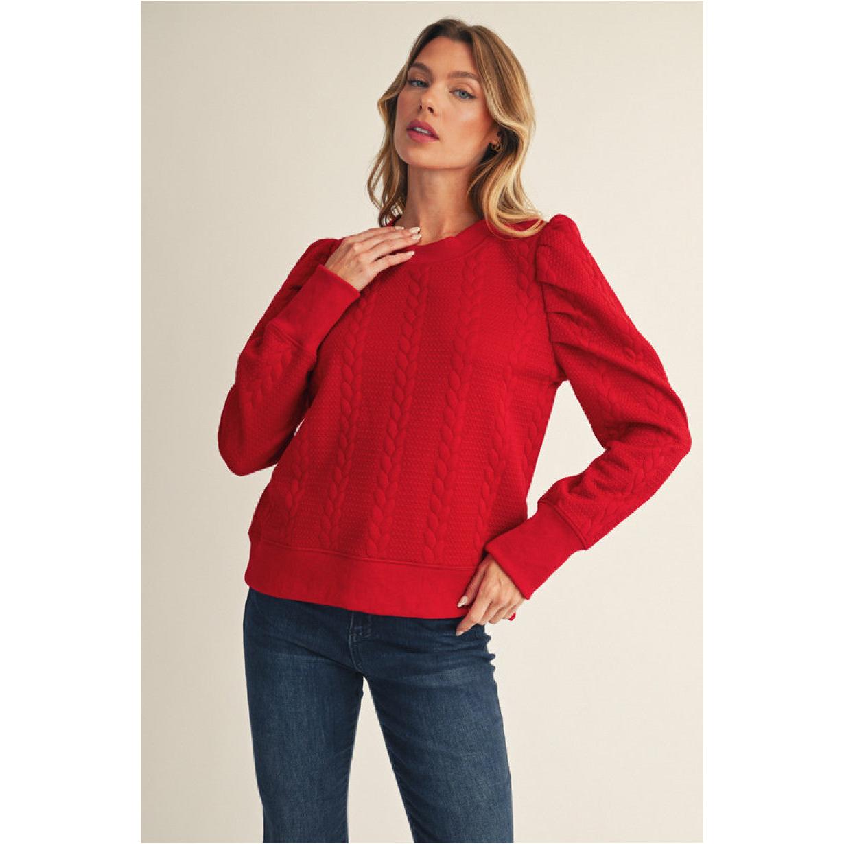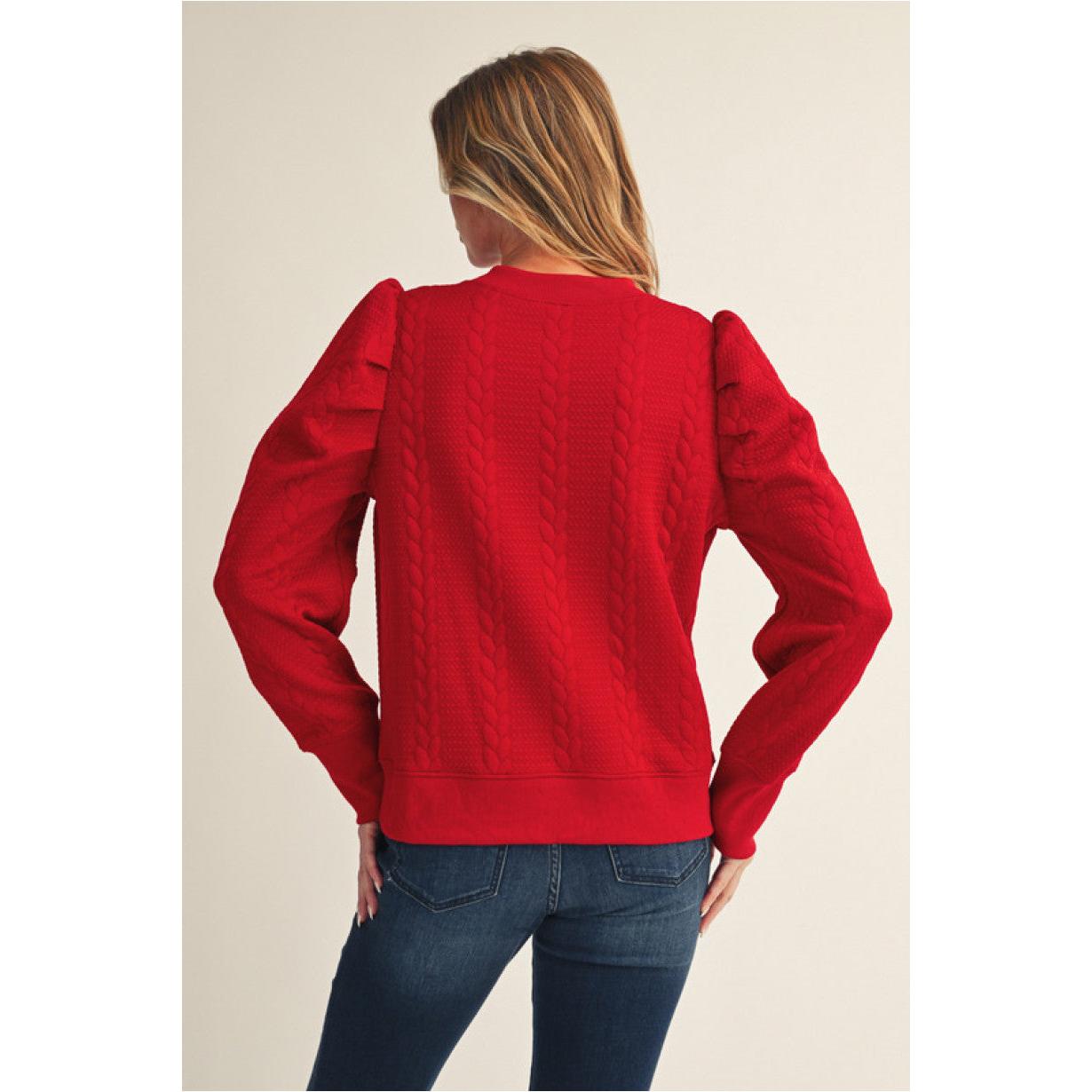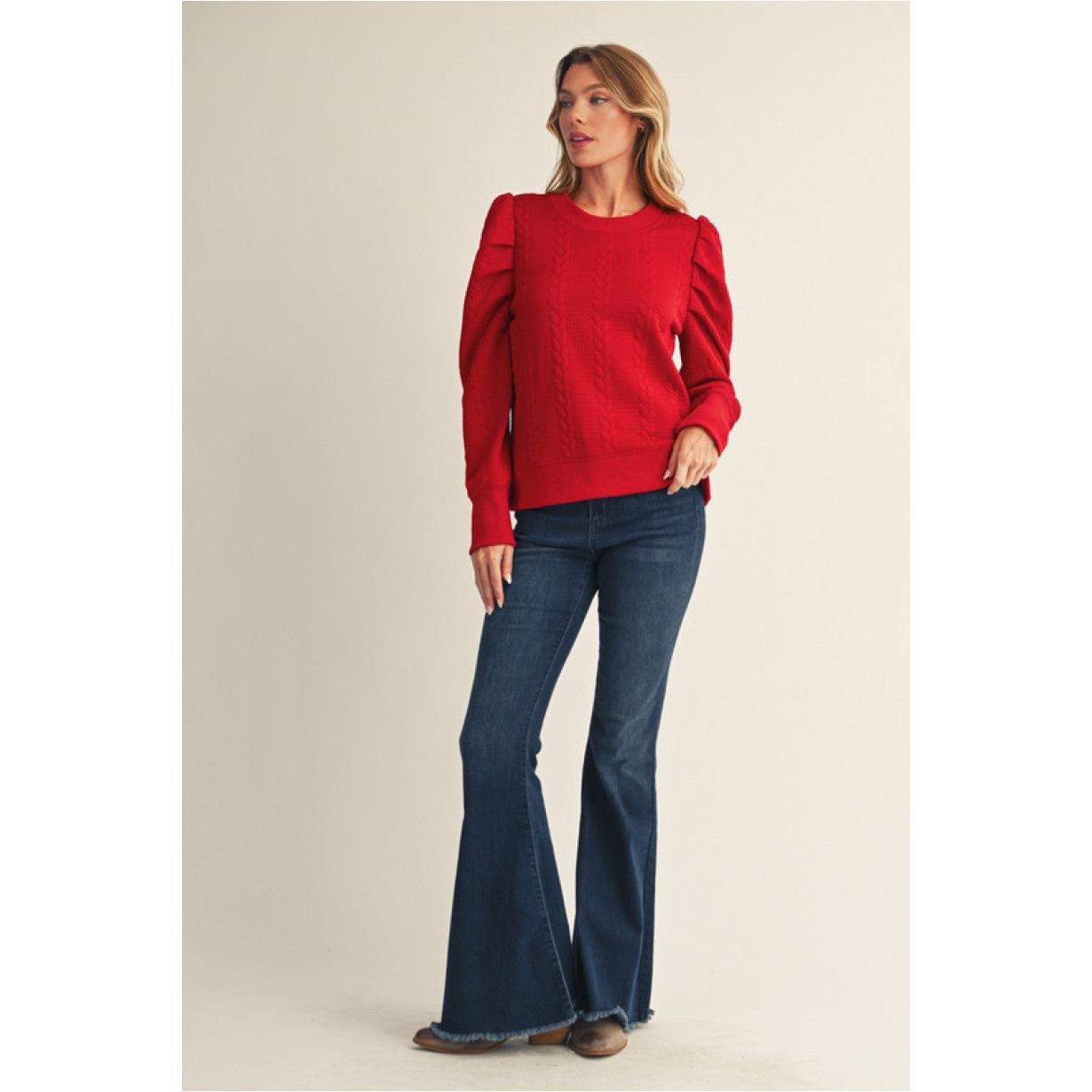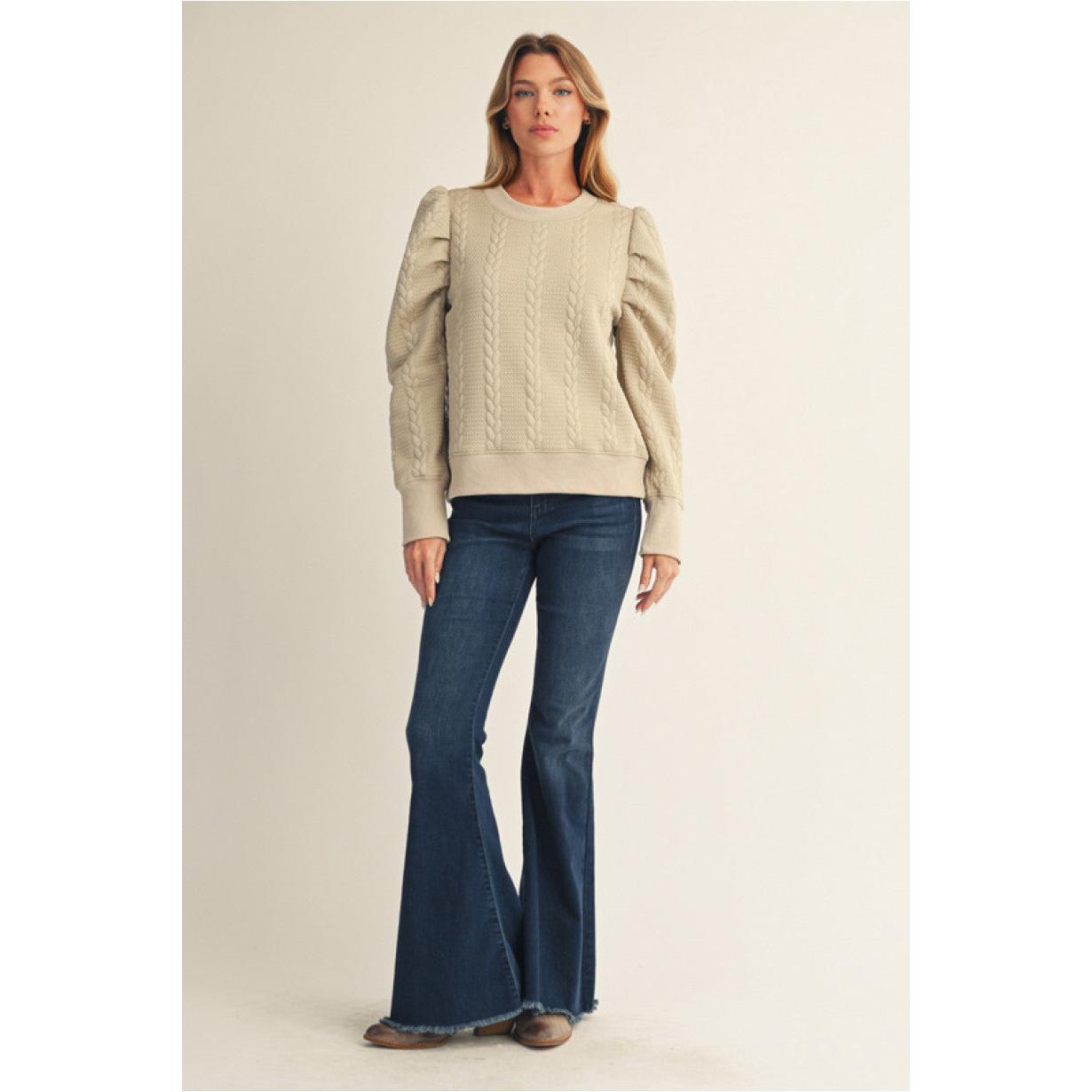 Puff shoulder braid textured casual top, pintuck detail on sleeves.