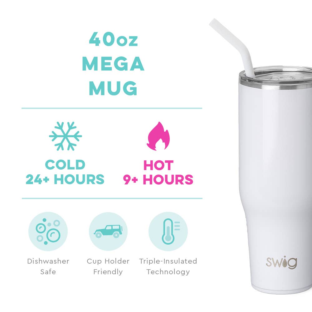 Mega sips, mega chill! 🧊 Hydrating has never been easier with our 40oz Insulated Mega Mug! A cup holder-friendly frame, a comfort-grip handle, and a plastic straw with a silicone flexi-tip all come together to create your new favorite Swig.