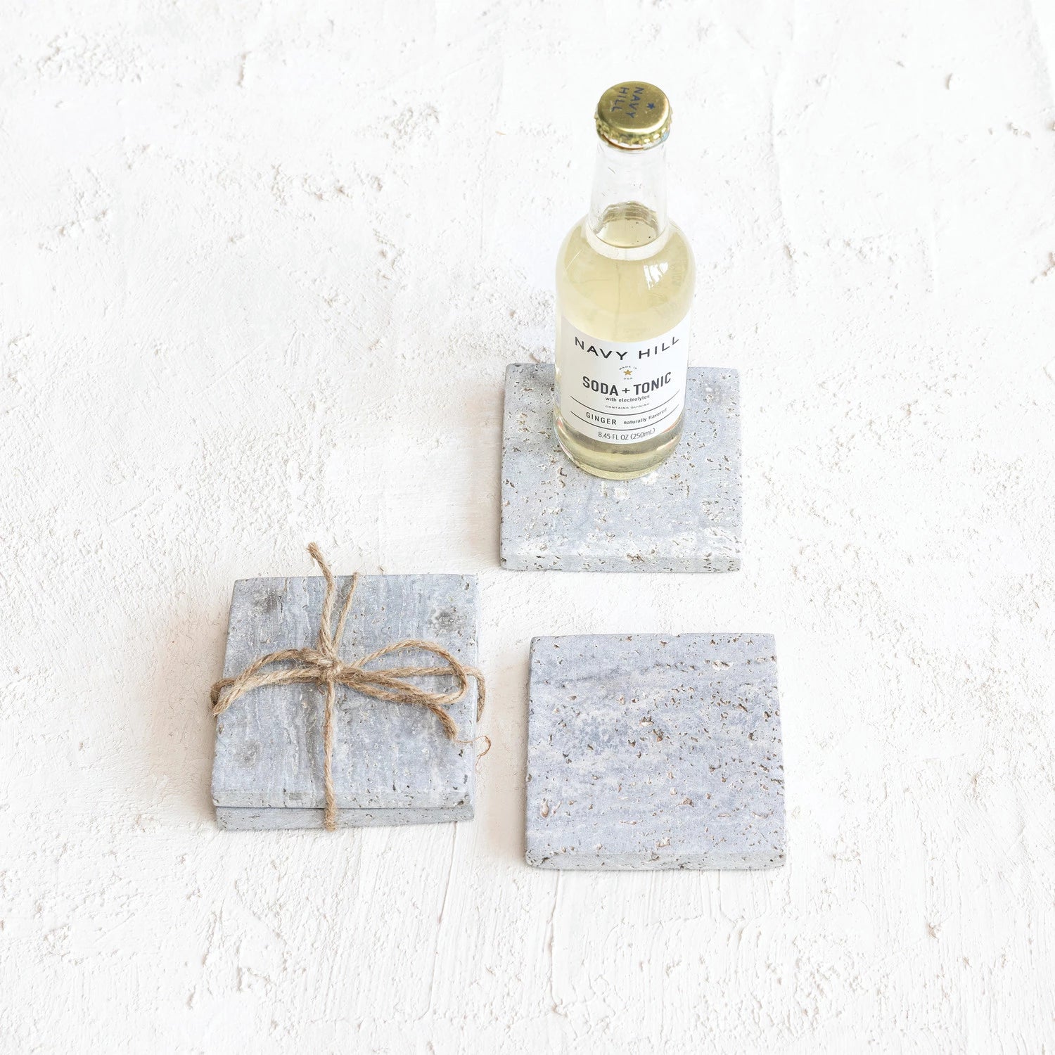 This set of four travertine coasters, natural is a beautiful and practical piece for any home. It consists of four square coasters that feature a natural travertine surface that has a textured and earthy look. The travertine surface is porous and absorbent, which means it can soak up moisture and prevent stains or rings on tables, countertops, or desks. The coasters are also easy to clean and maintain, and they will last for a long time. The coasters are versatile and can fit any style, from farmhouse to beach to boho to modern to coastal. They can also be used in any room, such as the kitchen, dining room, living room, or office. The coasters measure 4 inches in length and 4 inches in width (Each one will vary due to the nature of the stone), making them suitable for any space. This set of four travertine coasters, natural is a must-have for anyone who loves style and functionality.