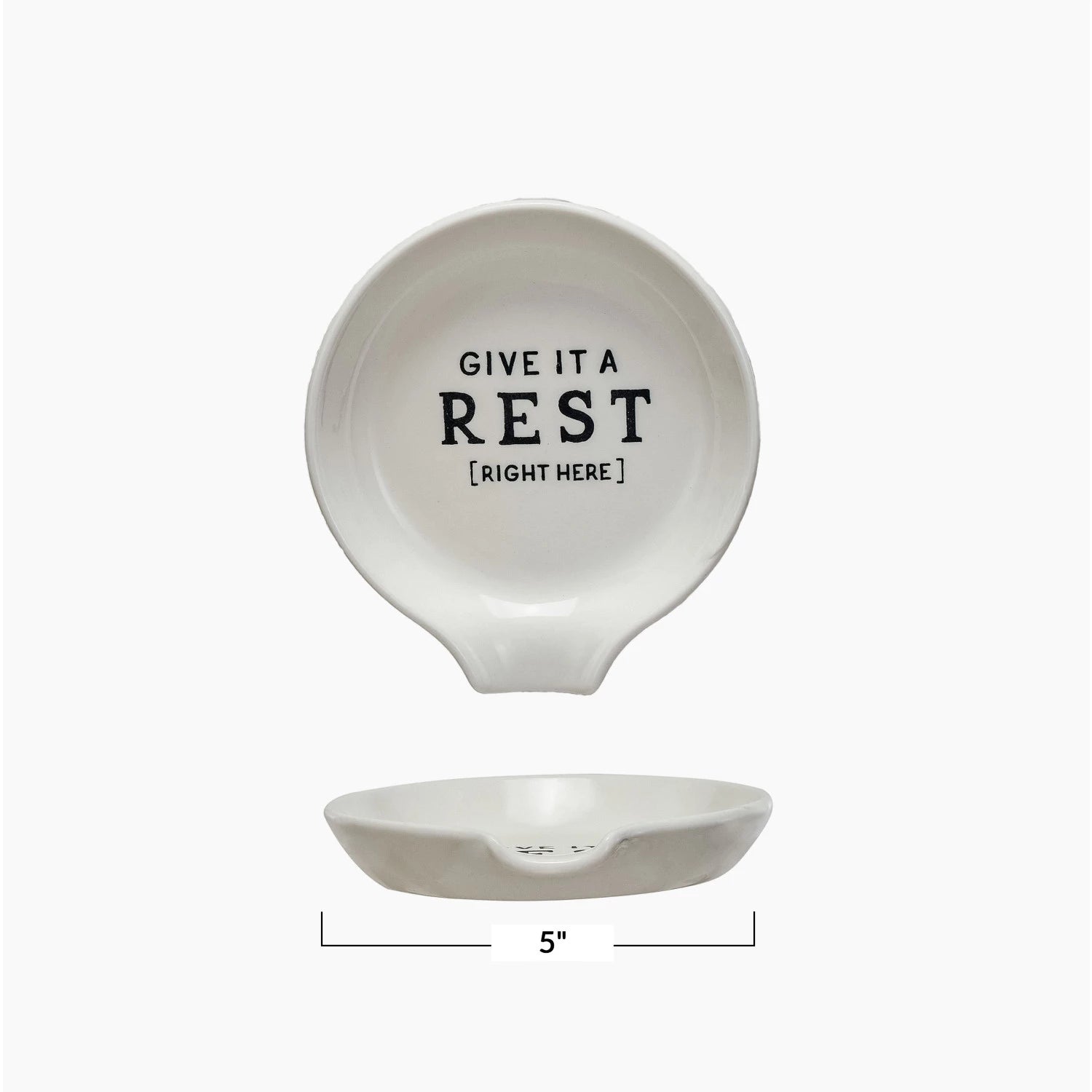 Stoneware Spoon Rest w/ Wax Relief Saying "Give It A Rest", White & Black