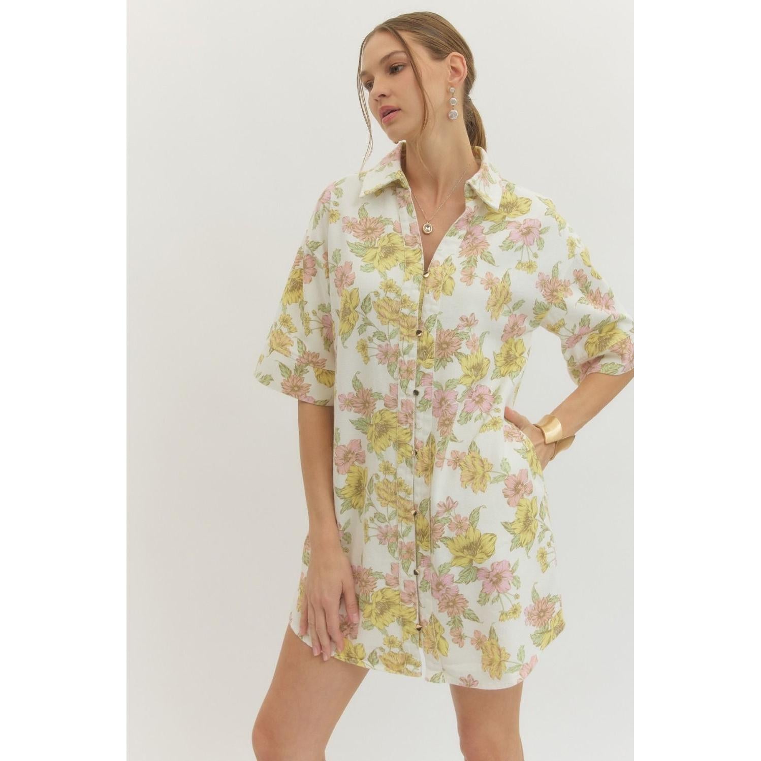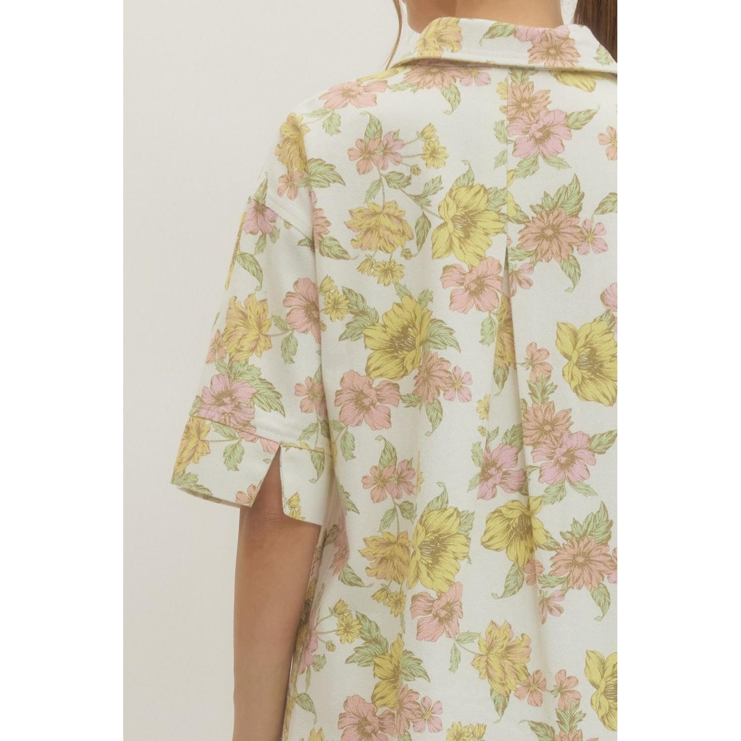 The Selah Floral Mini Dress blends effortless charm with easy everyday comfort. Designed in a soft woven fabric with a beautiful floral print, this half-sleeve shirt dress features a collared neckline and front button closure for a classic, polished look.